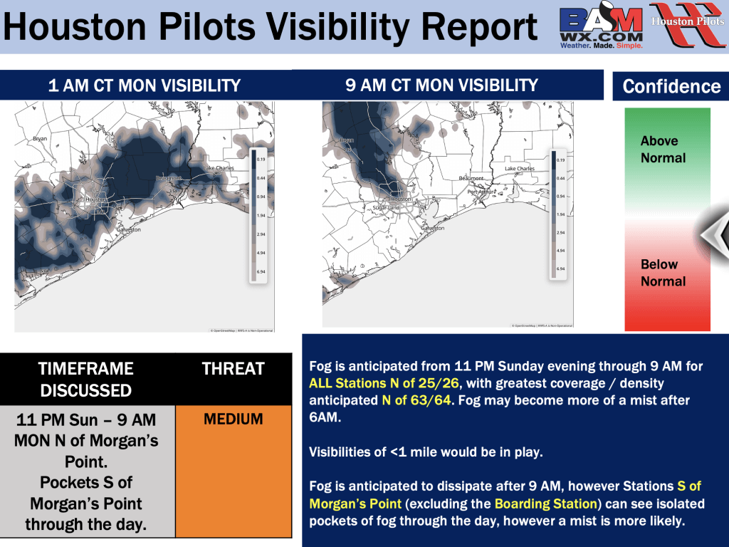 Good Sunday PM! Here is your latest Houston Pilots Forecast Package/Visibility Update! Visibility slides pertain to MON and TUE. If you have any forecast questions, please do not hesitate to reach out via our on call phone number (317)-560-8122, option 1.