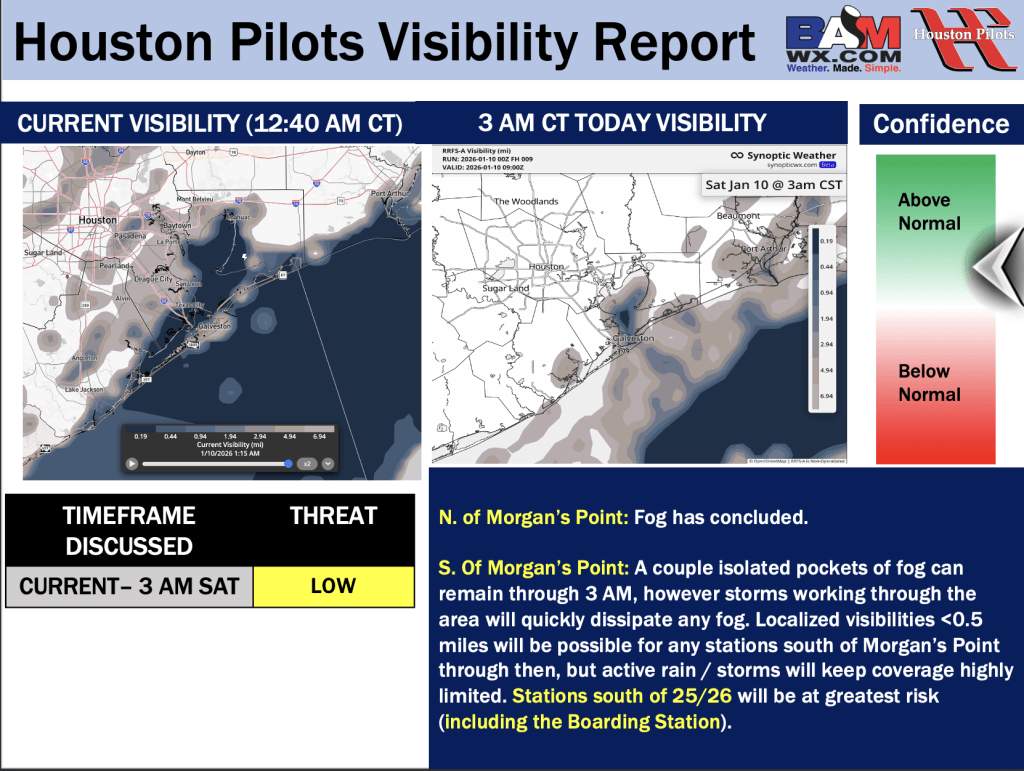 Good Saturday AM! Here is your latest Houston Pilots Forecast Package/ Visibility Update! Visibility Report pertains to TODAY. If you have any forecast questions, please do not hesitate to reach out via our on call phone number (317)-560-8122, option 1.
