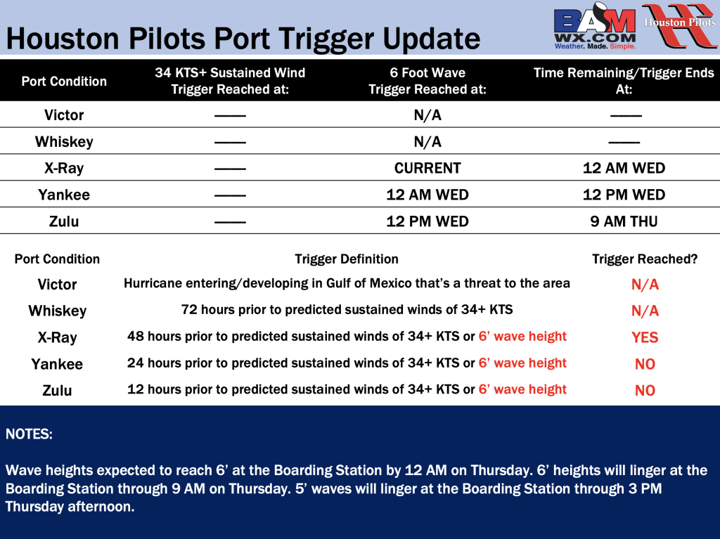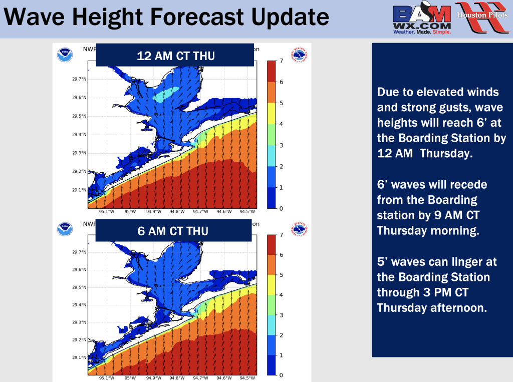 Good Tuesday PM! Here is your latest Houston Pilots Forecast Package! X-Ray Port Conditions are in effect for strong wind gusts and wave heights of 6′ on Thursday. If you have any forecast questions, please do not hesitate to reach out via our on call phone number (317)-560-8122, option 1.