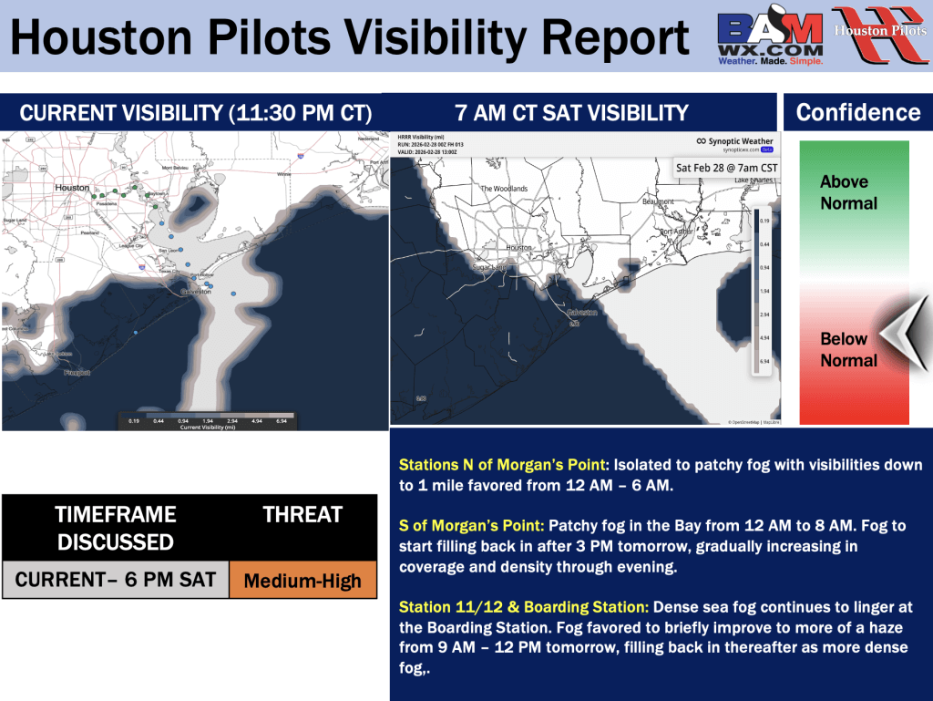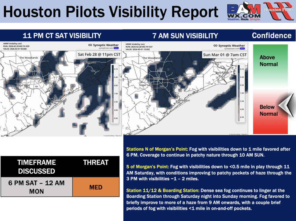 Good Saturday AM! Here is your latest Houston Pilots Forecast Package / Visibility Update! Visibility updates attached pertain to TODAY and SUN! If you have any forecast questions, please do not hesitate to reach out via our on call phone number (317)-560-8122, option 1.
