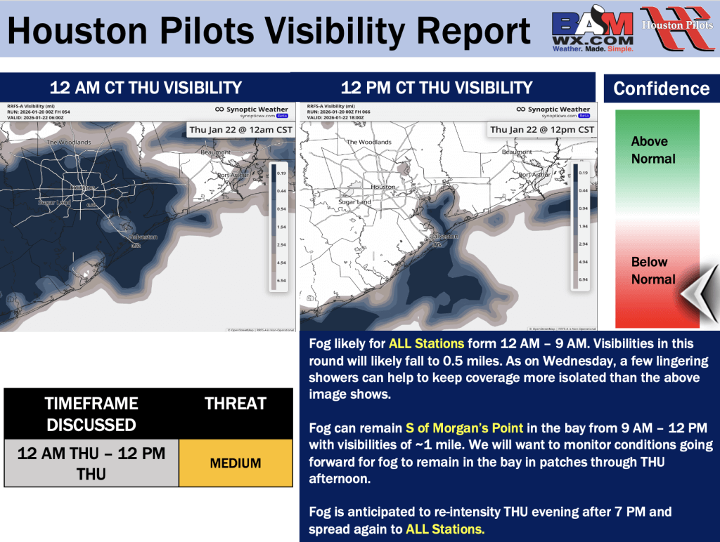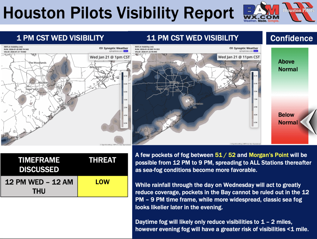 Good Tuesday AM! Here is your latest Houston Pilots Forecast Package. Visibility reports attached pertain to WED and THU. If you have any forecast questions, please do not hesitate to reach out via our on call phone number (317)-560-8122, option 1.
