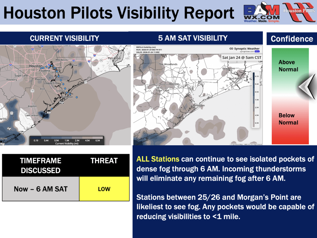 Good Saturday AM! Here is your latest Houston Pilots Forecast Package / Visibility Update! Visibility update pertains to TODAY. If you have any forecast questions, please do not hesitate to reach out via our on call phone number (317)-560-8122, option 1.