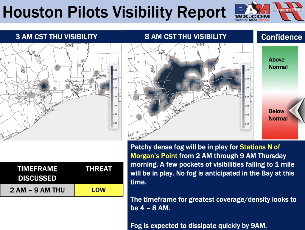 Good Thursday AM! Here is your latest Houston Pilots Forecast Package/Visibility Update! If you have any forecast questions, please do not hesitate to reach out via our on call phone number (317)-560-8122, option 1.