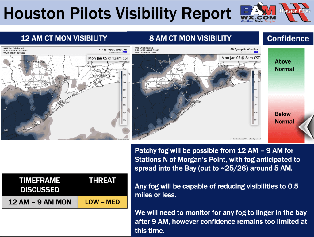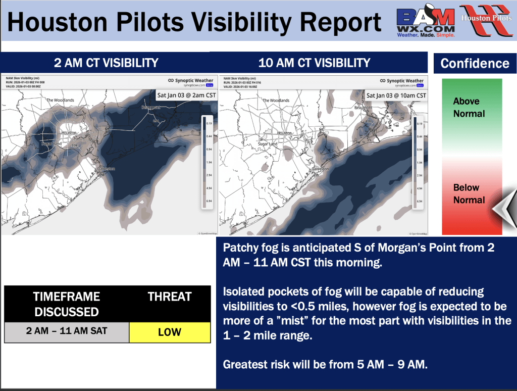 Good Saturday AM! Here is your latest Houston Pilots Forecast Package / Visibility Update! Visibility updates pertain to SAT and MON! If you have any forecast questions, please do not hesitate to reach out via our on call phone number (317)-560-8122, option 1.