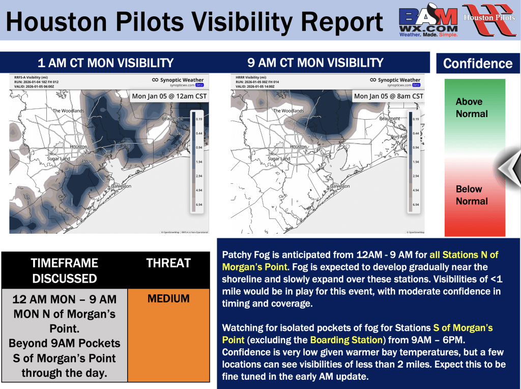 Good Sunday PM! Here is your latest Houston Pilots Forecast Package/Visibility Update! If you have any forecast questions, please do not hesitate to reach out via our on call phone number (317)-560-8122, option 1.
