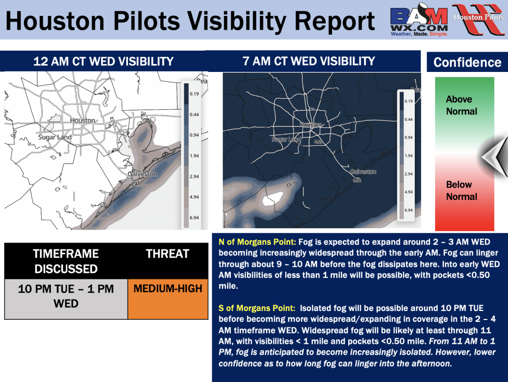 Good Tuesday PM! Here is your latest Houston Pilots Forecast Package/Visibility Update! If you have any forecast questions, please do not hesitate to reach out via our on call phone number (317)-560-8122, option 1.