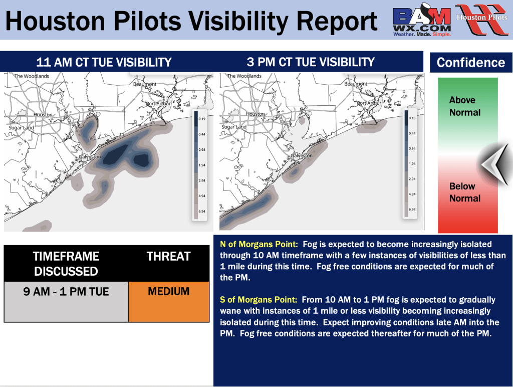 Good Tuesday AM! Here is your latest Houston Pilots Forecast Package/Visibility Update! Visibility slides pertain to TODAY and WED. If you have any forecast questions, please do not hesitate to reach out via our on call phone number (317)-560-8122, option 1.