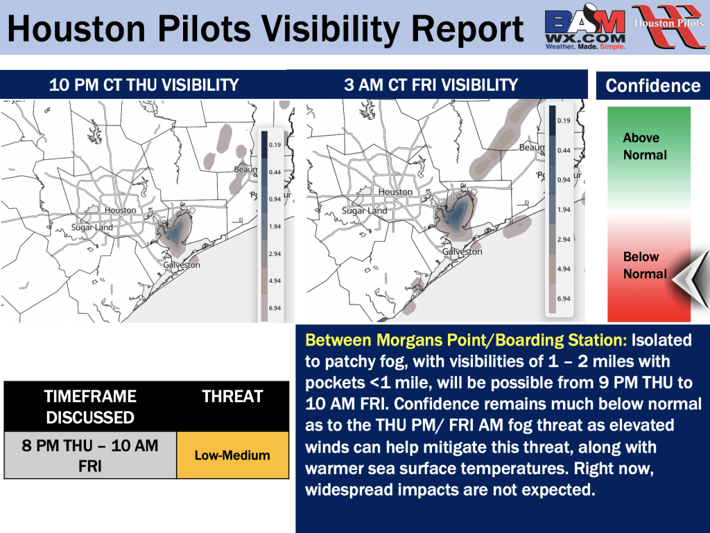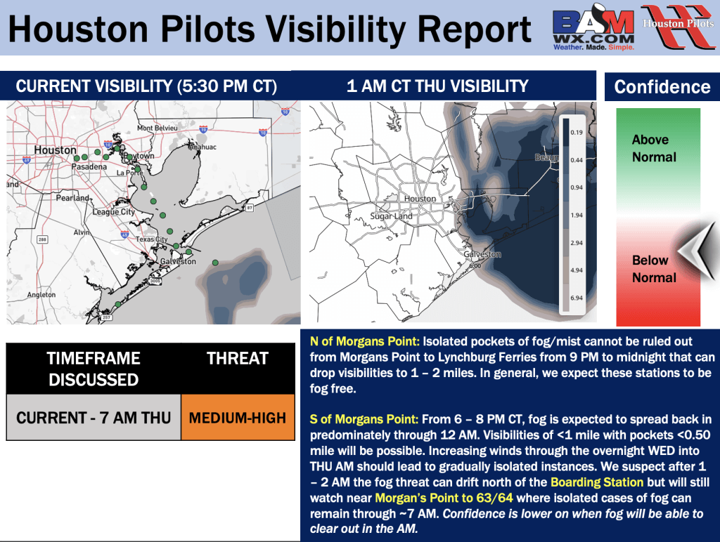 Good Wednesday PM! Here is your latest Houston Pilots Forecast Package/Visibility Update! If you have any forecast questions, please do not hesitate to reach out via our on call phone number (317)-560-8122, option 1.