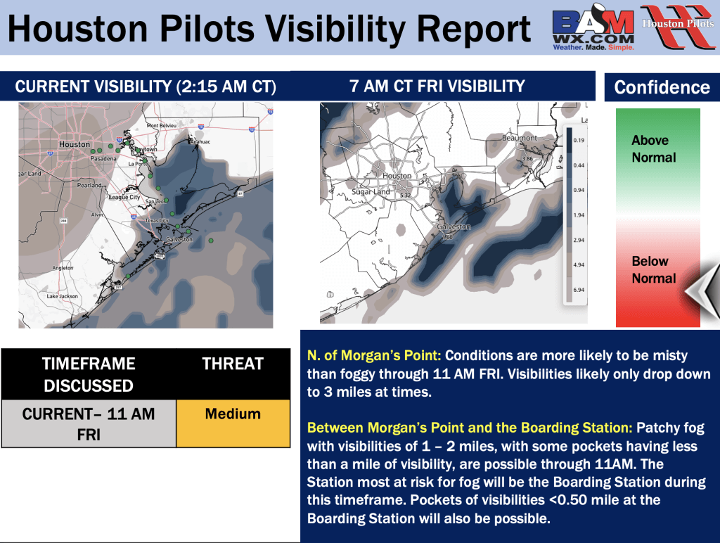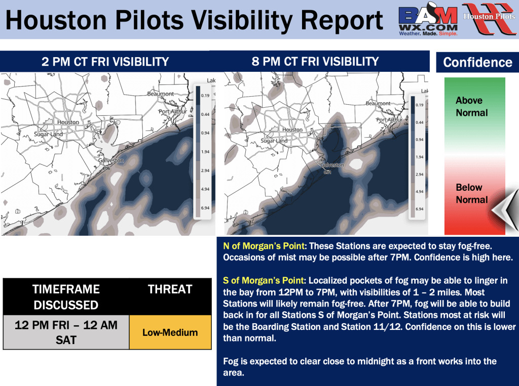 Good Friday AM! Here is your latest Houston Pilots Forecast Package/ Visibility Update! If you have any forecast questions, please do not hesitate to reach out via our on call phone number (317)-560-8122, option 1.