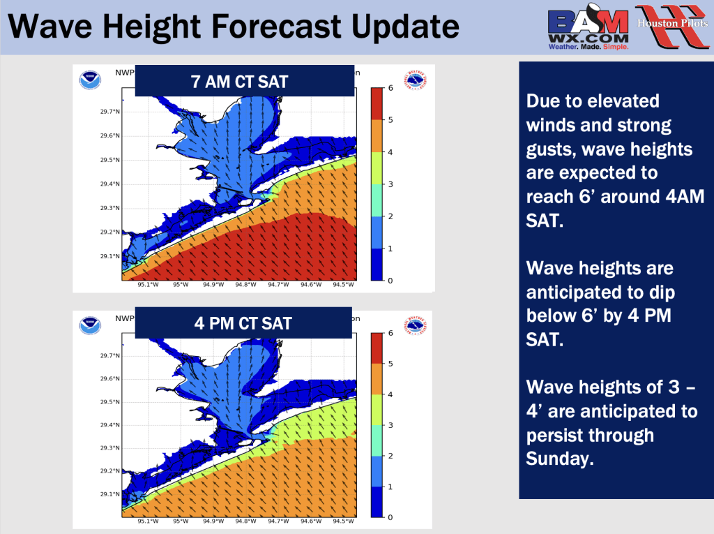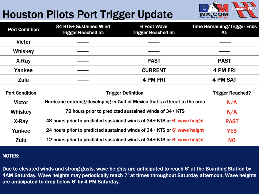 Good Friday PM! Here is your latest Houston Pilots forecast package and port trigger update! Yankee conditions are in effect due to elevated wave heights expected at the Boarding Station. If you have any forecast questions, please do not hesitate to reach out via our on call phone number (317)-560-8122, option 1.