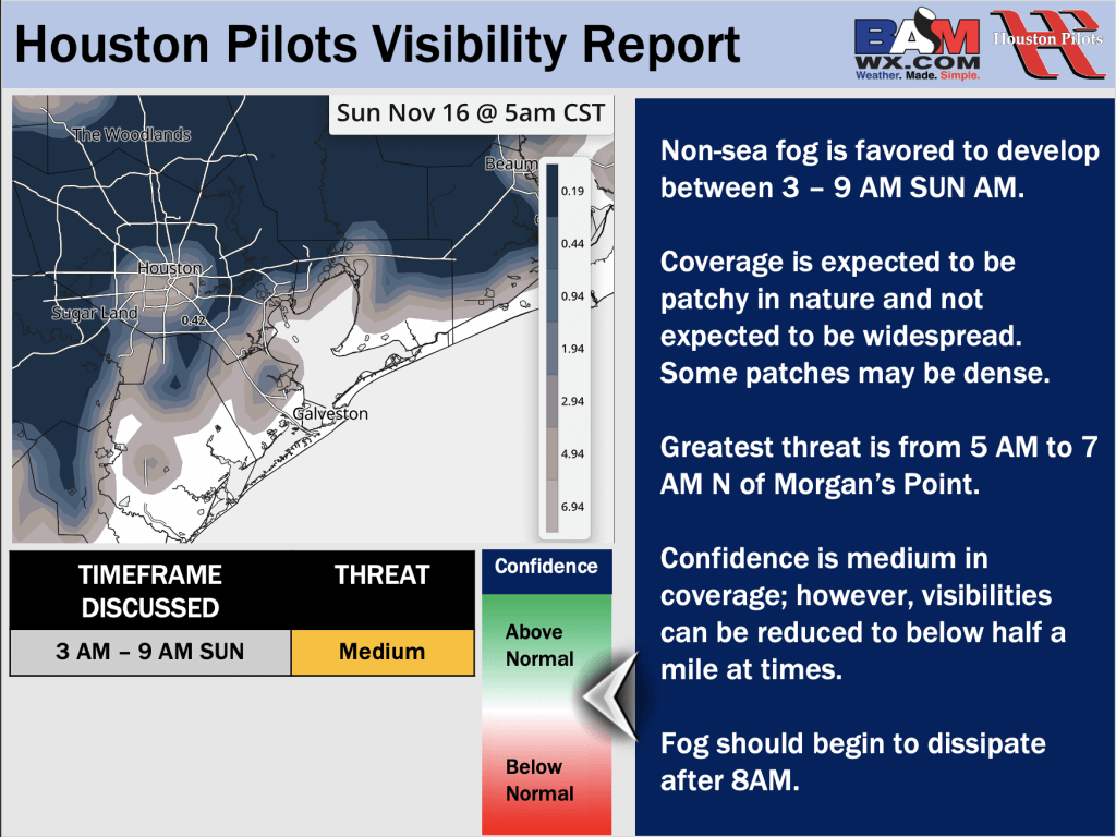 Good Saturday PM! Here is your latest Houston Pilots visibility update! If you have any forecast questions, please do not hesitate to reach out via our on call phone number (317)-560-8122, option 1.