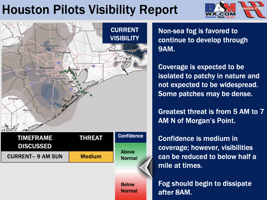Good Sunday AM! Here is your latest Houston Pilots Visibility Update! If you have any forecast questions, please do not hesitate to reach out via our on call phone number (317)-560-8122, option 1.