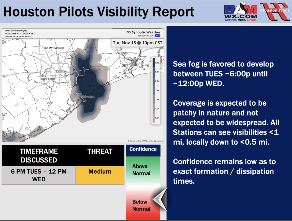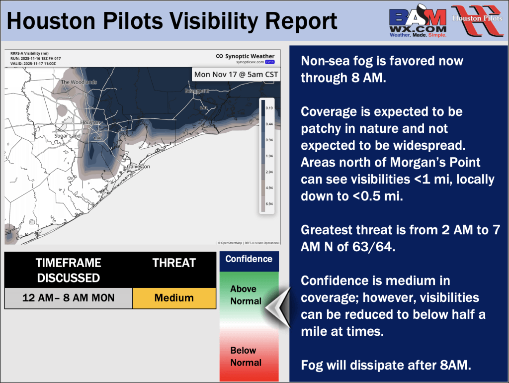 Good Monday AM! Here is your latest Houston Pilots Forecast Package/visibility update! If you have any forecast questions, please do not hesitate to reach out via our on call phone number (317)-560-8122, option 1.