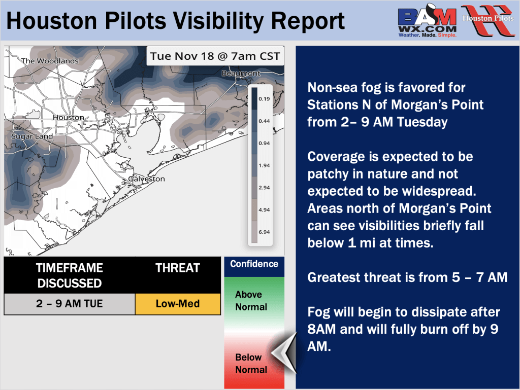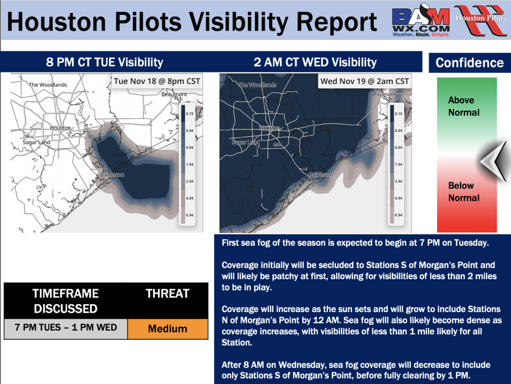 Good Monday PM! Here is your latest Houston Pilots Forecast Package/visibility update! If you have any forecast questions, please do not hesitate to reach out via our on call phone number (317)-560-8122, option 1.