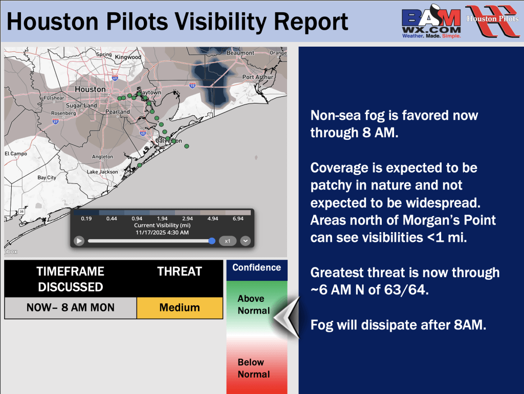 Good Monday AM! Here is your latest Houston Pilots Visibility Update! If you have any forecast questions, please do not hesitate to reach out via our on call phone number (317)-560-8122, option 1.