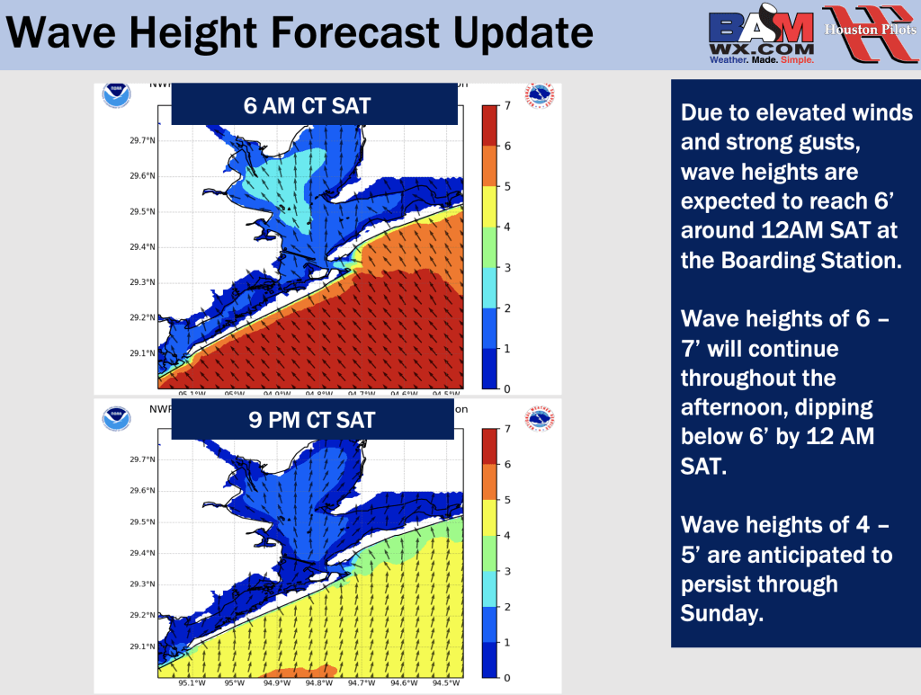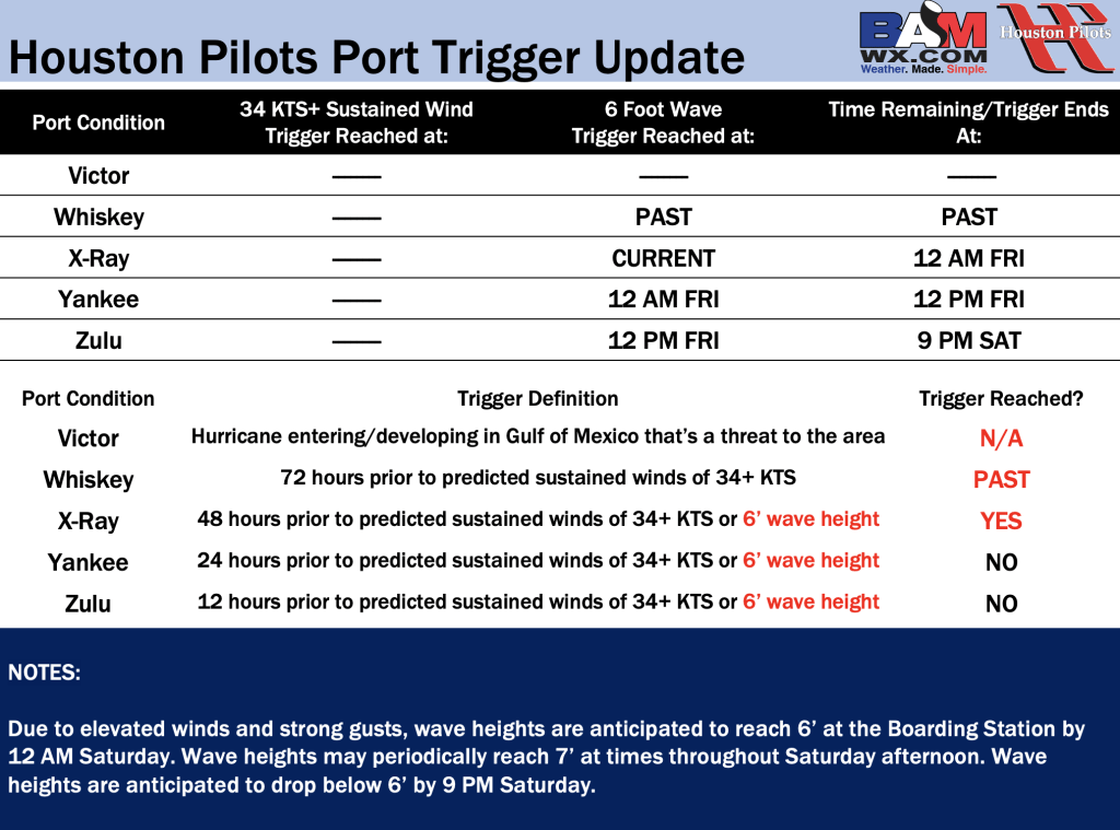 Good Thursday PM! Here is your latest Houston Pilots Forecast Package/Port Trigger update! X-Ray Port Trigger is currently in effect due to 6′ wave heights anticipated at the Boarding Station Saturday. If you have any forecast questions, please do not hesitate to reach out via our on call phone number (317)-560-8122, option 1.