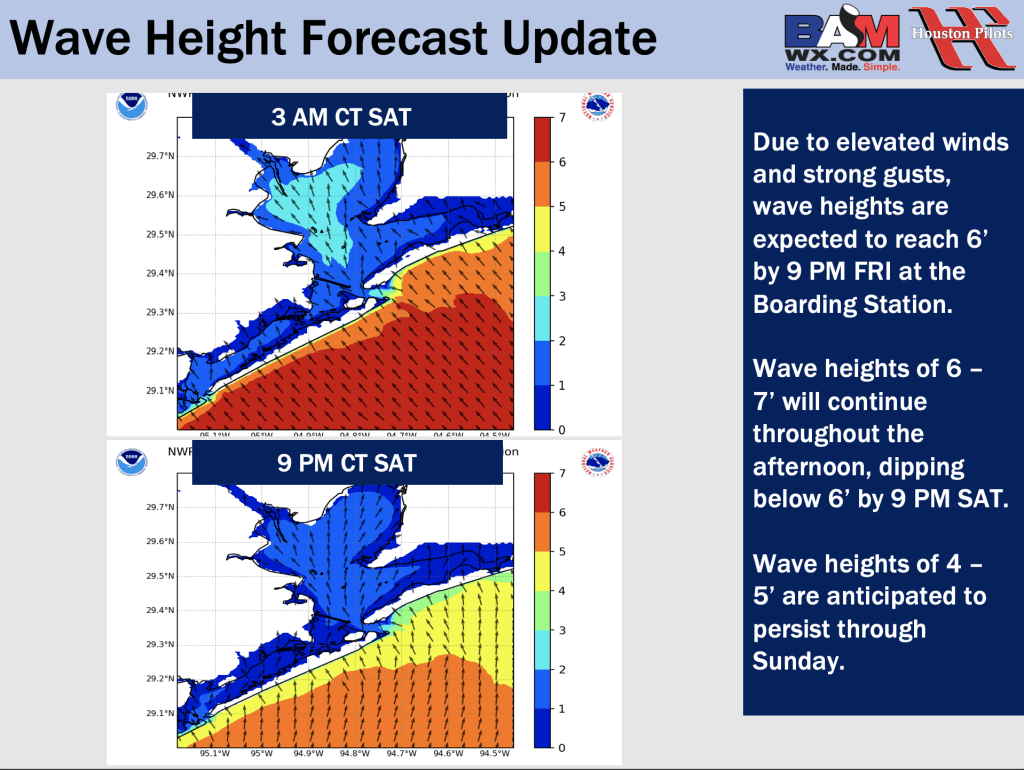 Good Friday AM! Here is your latest Houston Pilots Forecast Package/Port Trigger update! Yankee Port Trigger is currently in effect due to 6′ wave heights anticipated at the Boarding Station beginning Friday night. If you have any forecast questions, please do not hesitate to reach out via our on call phone number (317)-560-8122, option 1.
