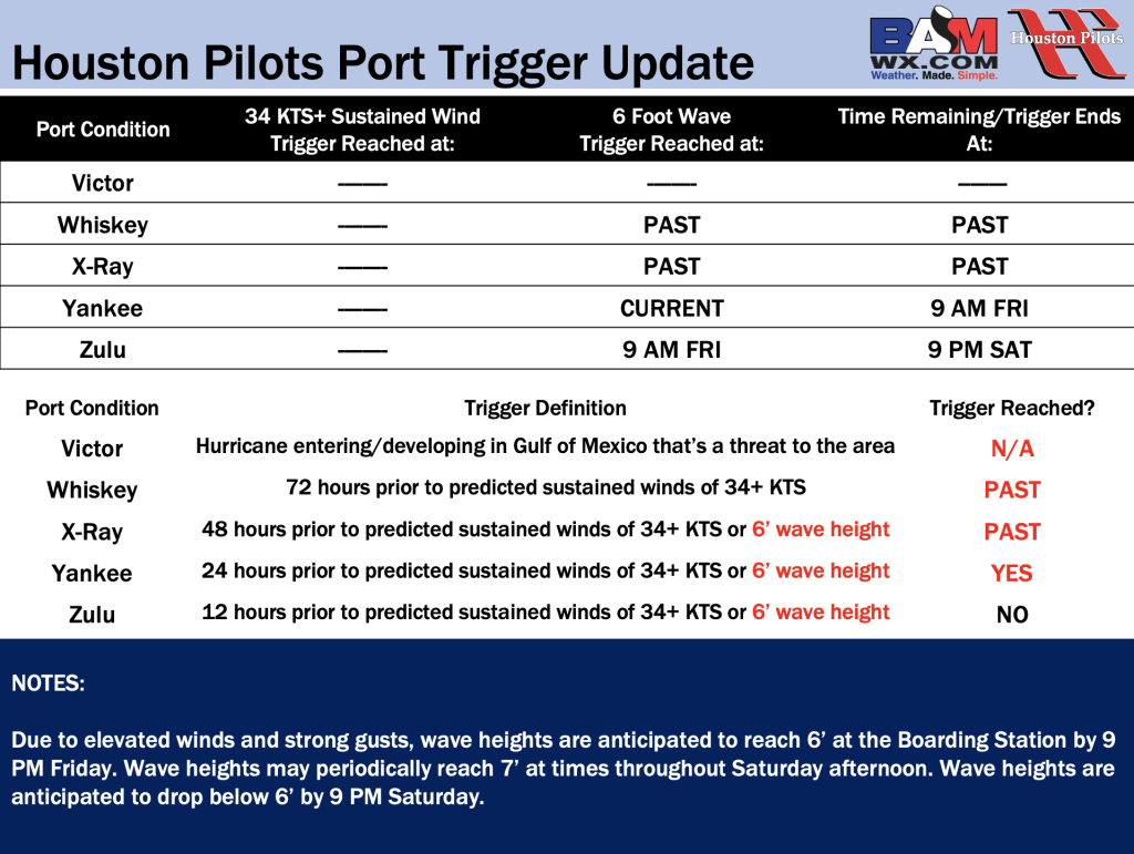 Good Friday AM! Here is your latest Houston Pilots Forecast Package/Port Trigger update! Yankee Port Trigger is currently in effect due to 6′ wave heights anticipated at the Boarding Station beginning Friday night. If you have any forecast questions, please do not hesitate to reach out via our on call phone number (317)-560-8122, option 1.