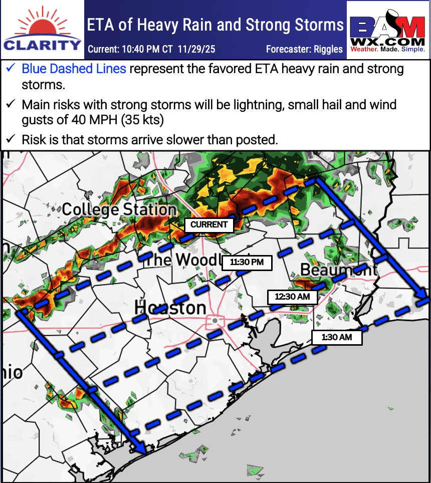 Good Sunday AM! Here is your latest Houston Pilots Forecast Package/Nowcast update! Attached graphic depicts the favored ETA of strong storms currently North of all Stations. Main risk is that storm timing is slower than attached graphic. If you have any forecast questions, please do not hesitate to reach out via our on call phone number (317)-560-8122, option 1.