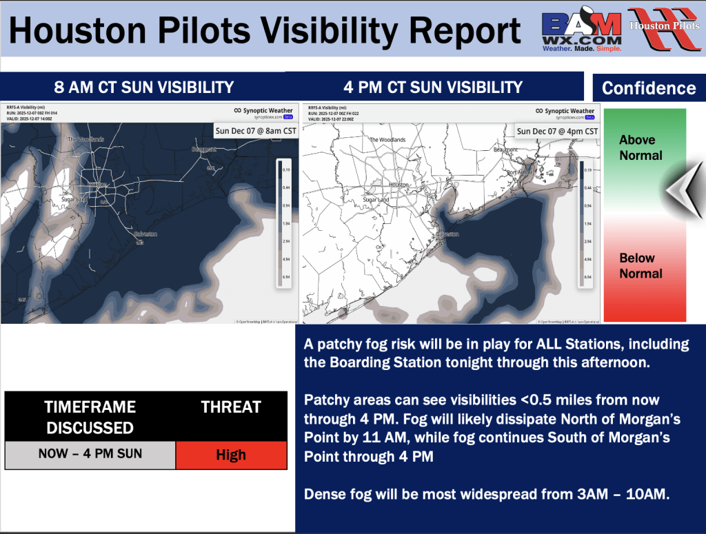 Good Sunday AM! Here is your latest Houston Pilots Forecast Package! Visibility Updates attached pertain to Sunday AM and Tuesday AM. If you have any forecast questions, please do not hesitate to reach out via our on call phone number (317)-560-8122, option 1.