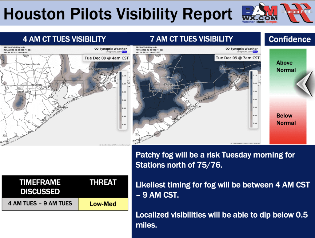Good Monday AM! Here is your latest Houston Pilots Forecast Package! Visibility Updates attached pertain to TUES and WED. If you have any forecast questions, please do not hesitate to reach out via our on call phone number (317)-560-8122, option 1.
