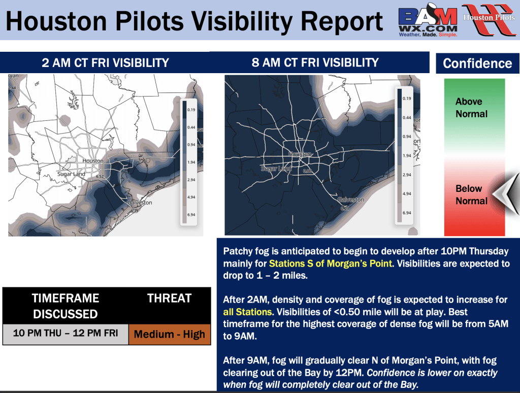 Good Thursday AM! Here is your latest Houston Pilots Forecast Package/Visibility Update! If you have any forecast questions, please do not hesitate to reach out via our on call phone number (317)-560-8122, option 1.