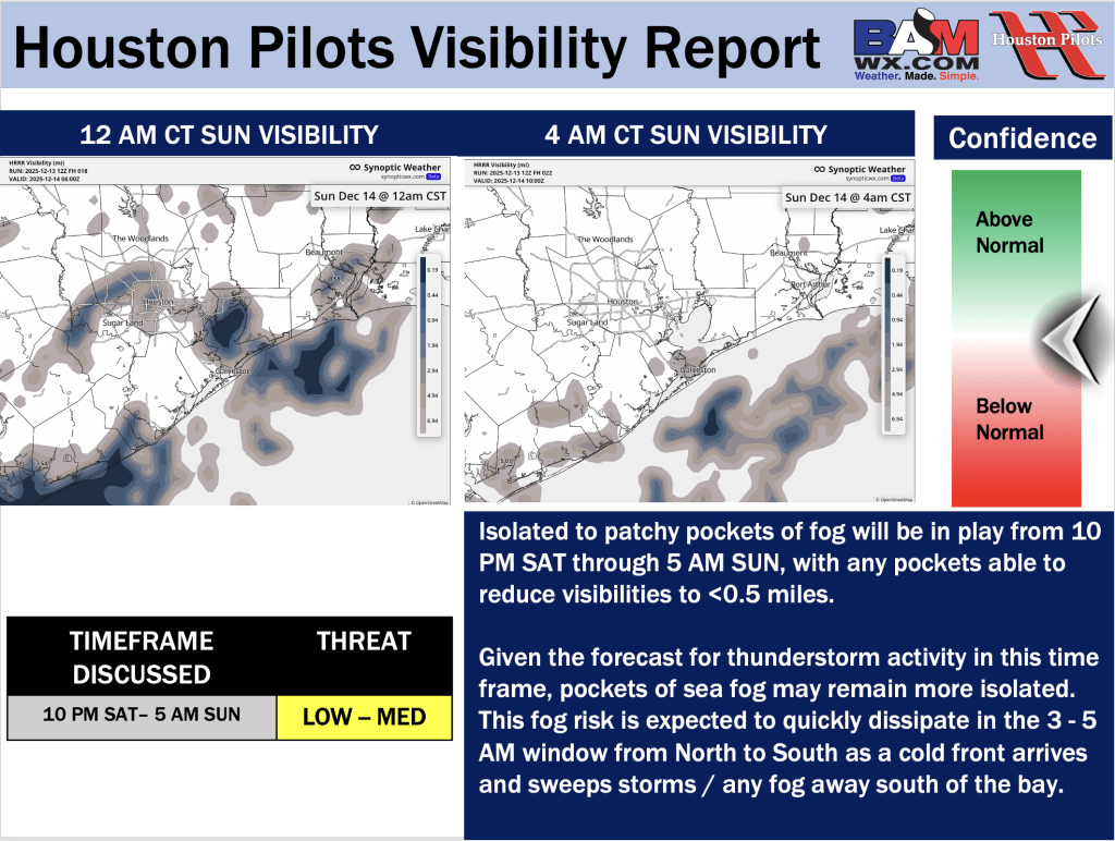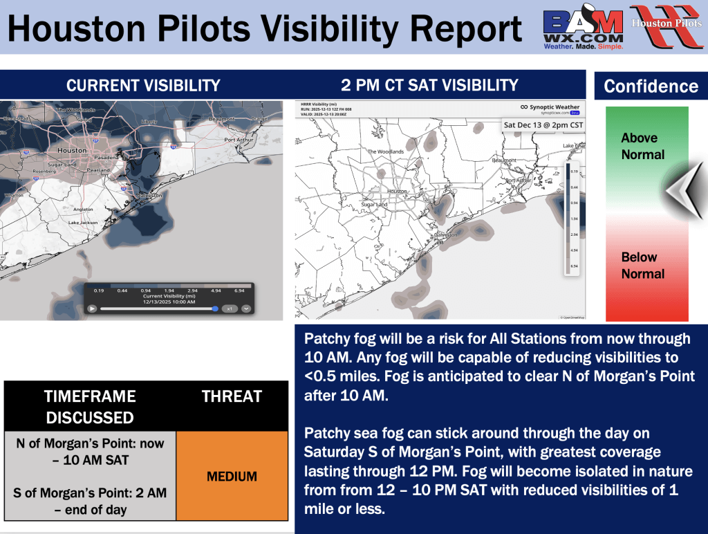 Good Saturday Late AM! Here is your latest Houston Pilots Forecast Package! Visibility Updates attached pertain to TODAY and SUN. If you have any forecast questions, please do not hesitate to reach out via our on call phone number (317)-560-8122, option 1.