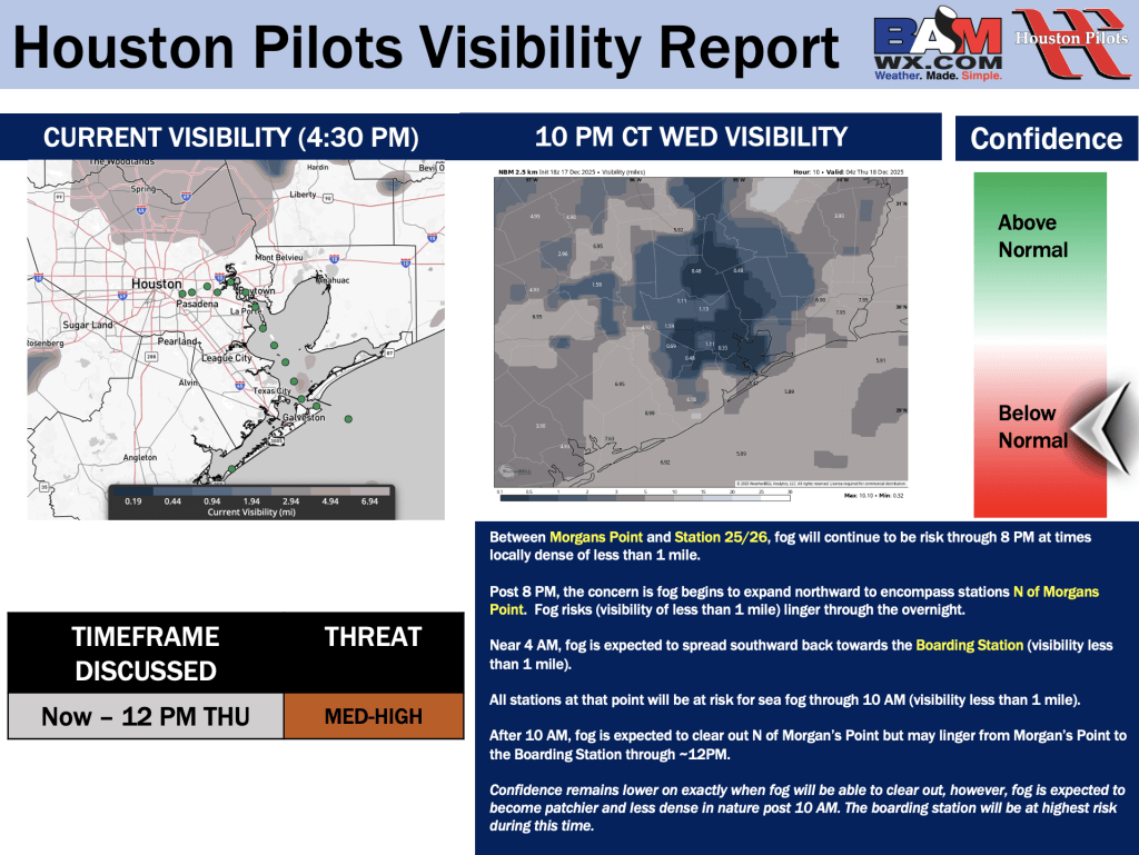 Good Wednesday PM! Here is your latest Houston Pilots Forecast Package/Visibility Update! If you have any forecast questions, please do not hesitate to reach out via our on call phone number (317)-560-8122, option 1.