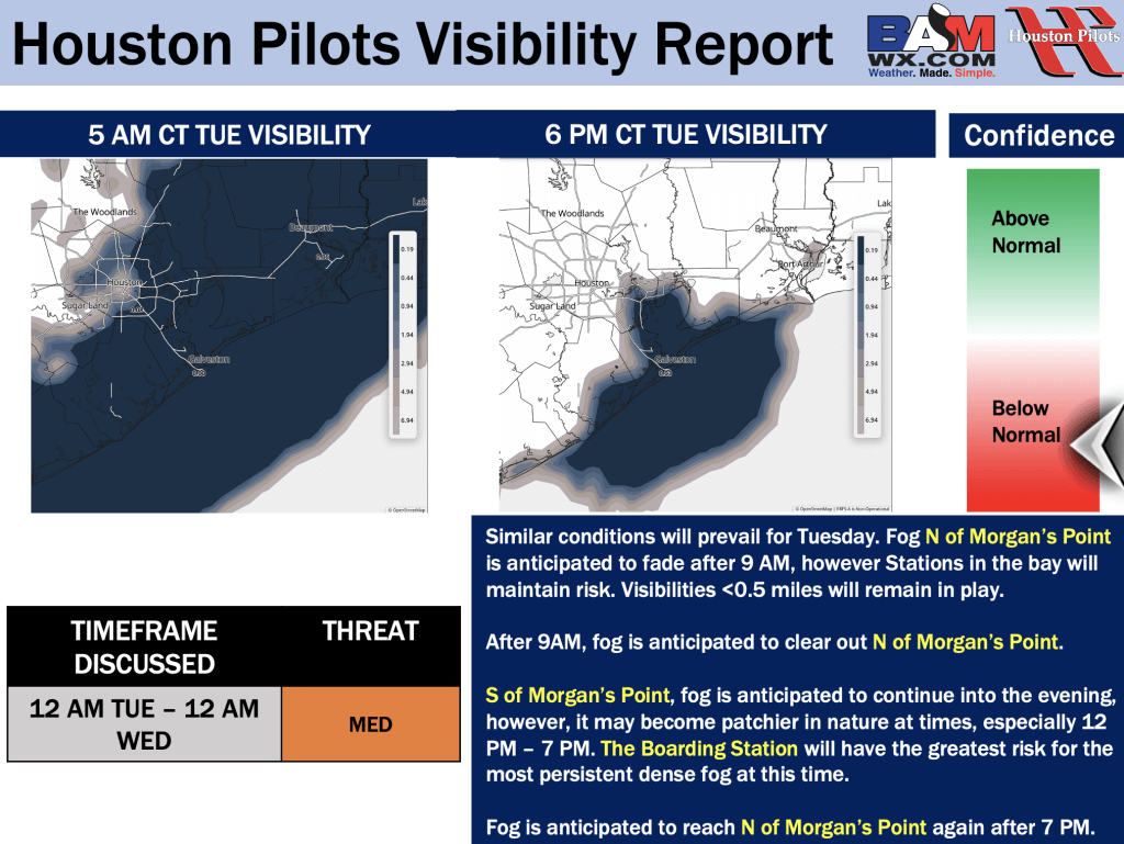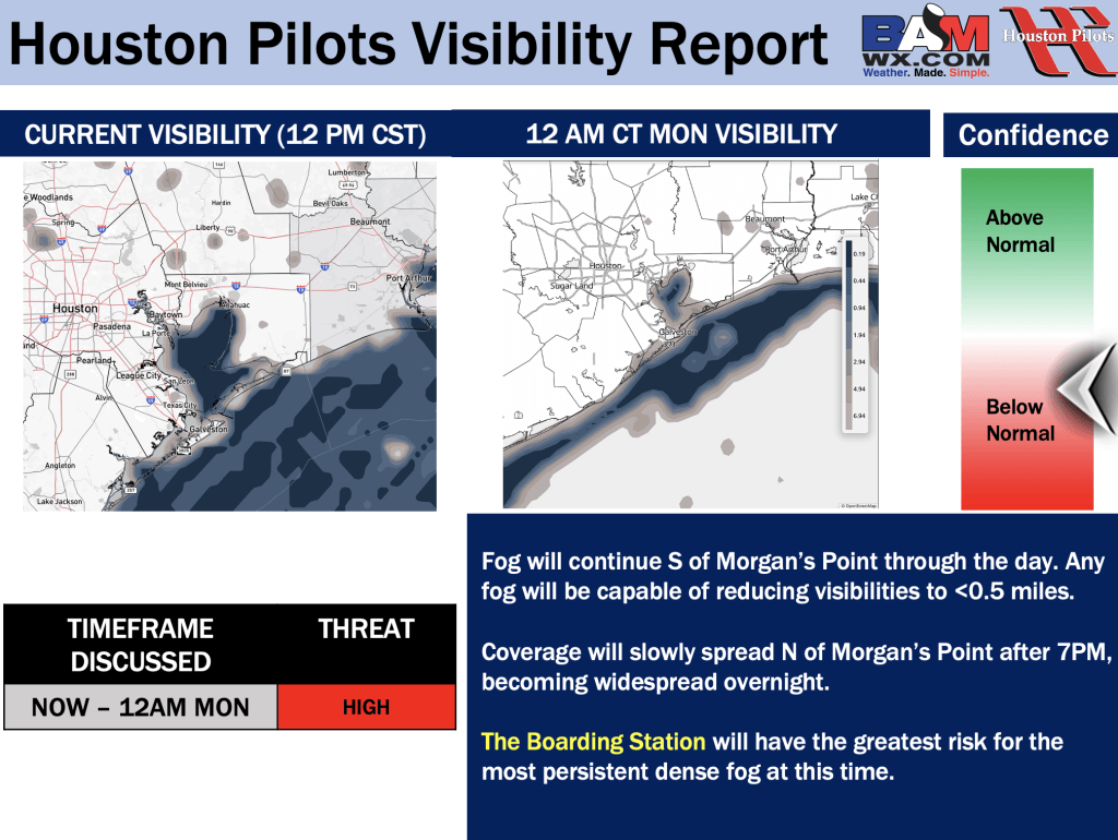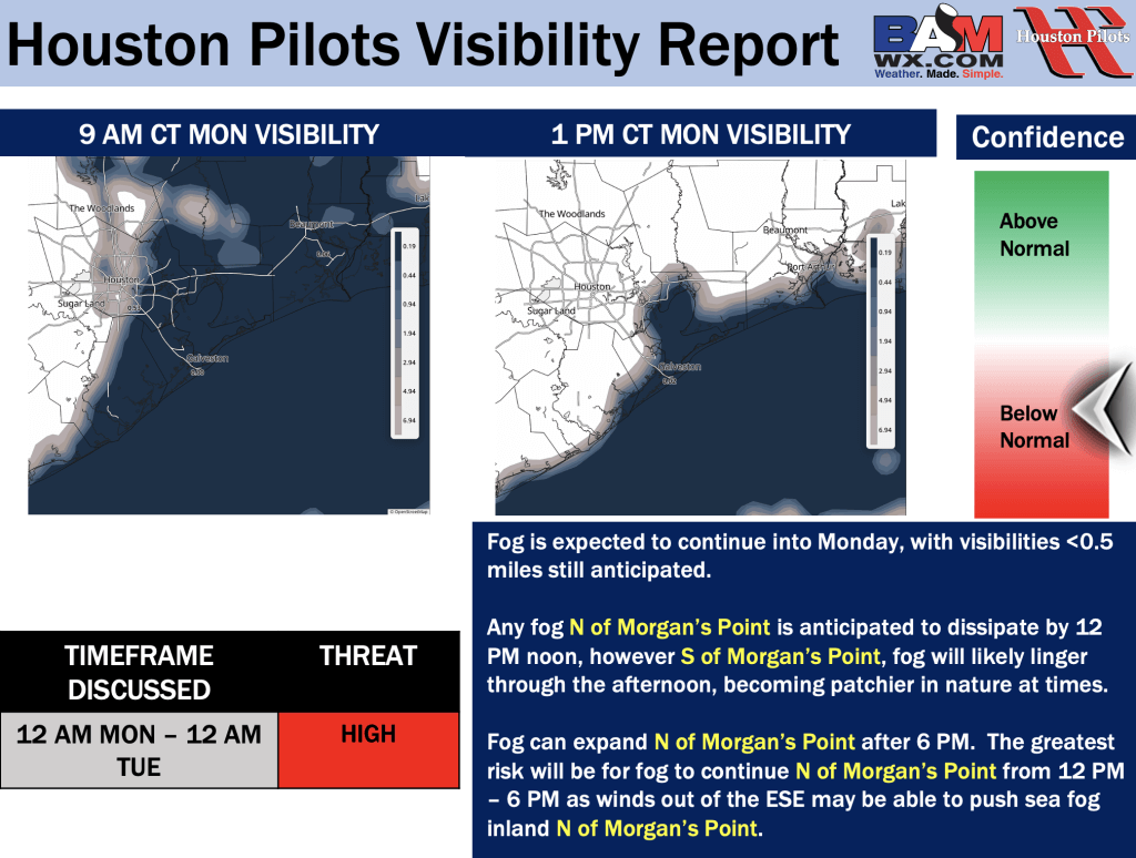 Good Sunday PM! Here is your latest Houston Pilots Forecast Package/Visibility Update! Visibility Update attached pertains to TODAY, MON, and TUE. If you have any forecast questions, please do not hesitate to reach out via our on call phone number (317)-560-8122, option 1.