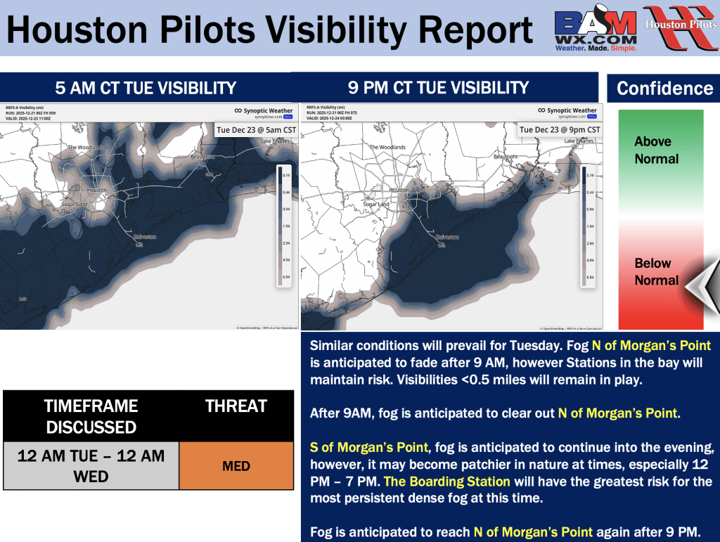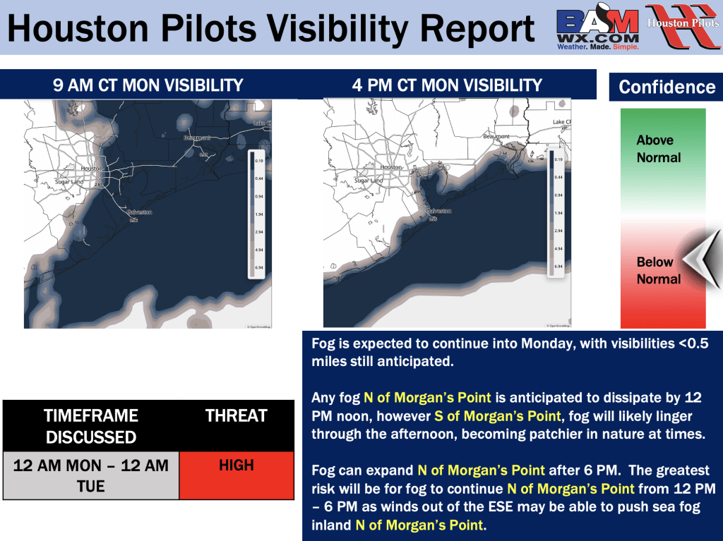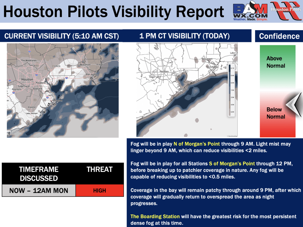 Good Sunday AM! Here is your latest Houston Pilots Visibility Update! Visibility Update attached pertains to TODAY, MON, and TUE. If you have any forecast questions, please do not hesitate to reach out via our on call phone number (317)-560-8122, option 1.