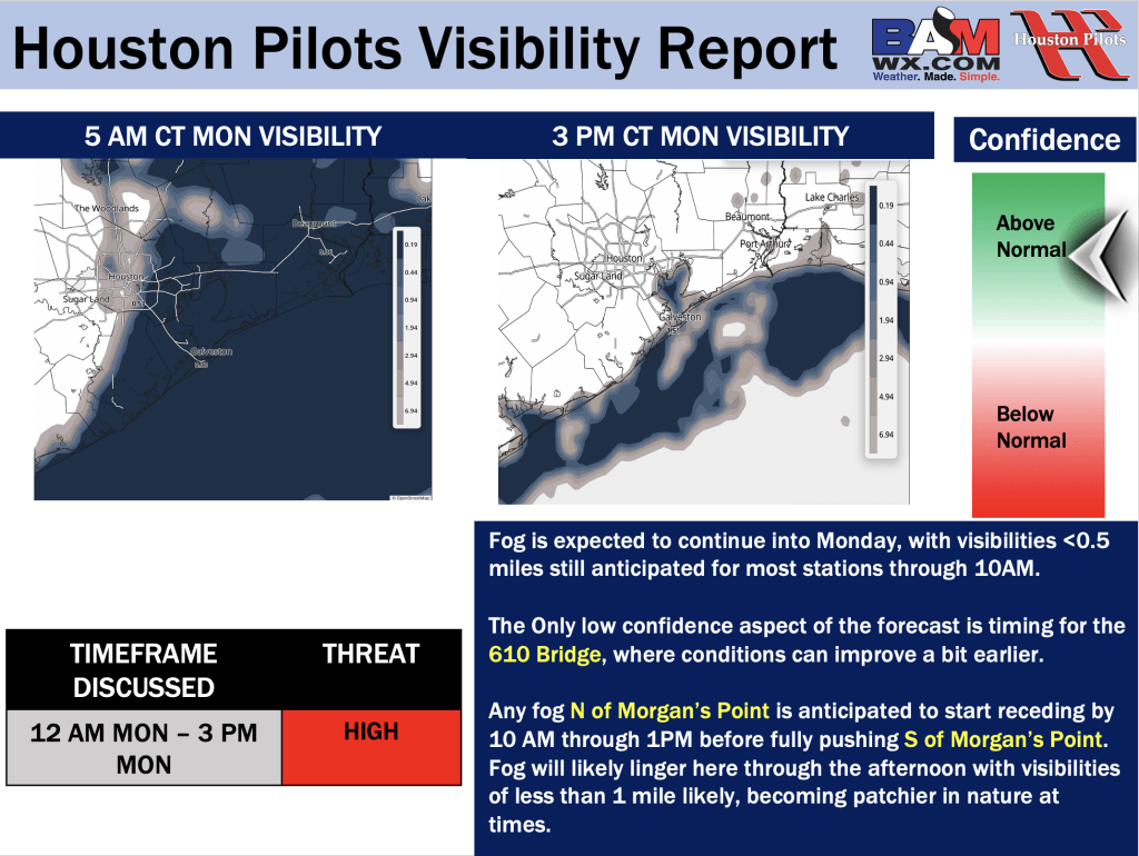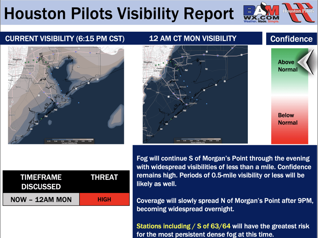Good Sunday PM! Here is your latest Houston Pilots Forecast Package/Visibility Update! Visibility Update attached pertains to TODAY, MON, and TUE. If you have any forecast questions, please do not hesitate to reach out via our on call phone number (317)-560-8122, option 1.