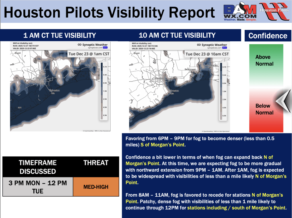 Good Monday AM! Here is your latest Houston Pilots Forecast Package/Visibility Update! Visibility Update attached pertains to TODAY through T. If you have any forecast questions, please do not hesitate to reach out via our on call phone number (317)-560-8122, option 1.
