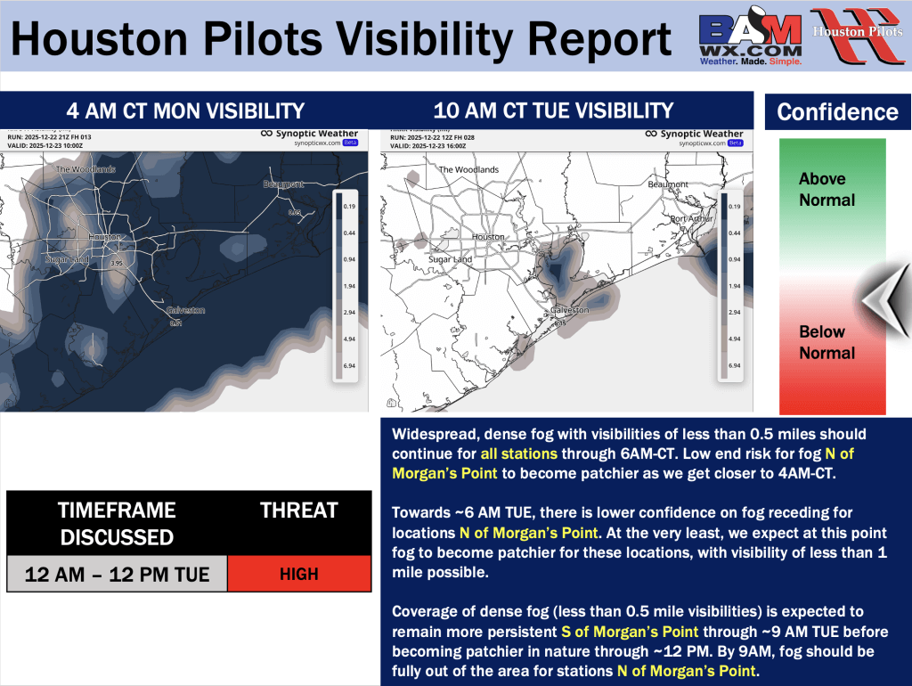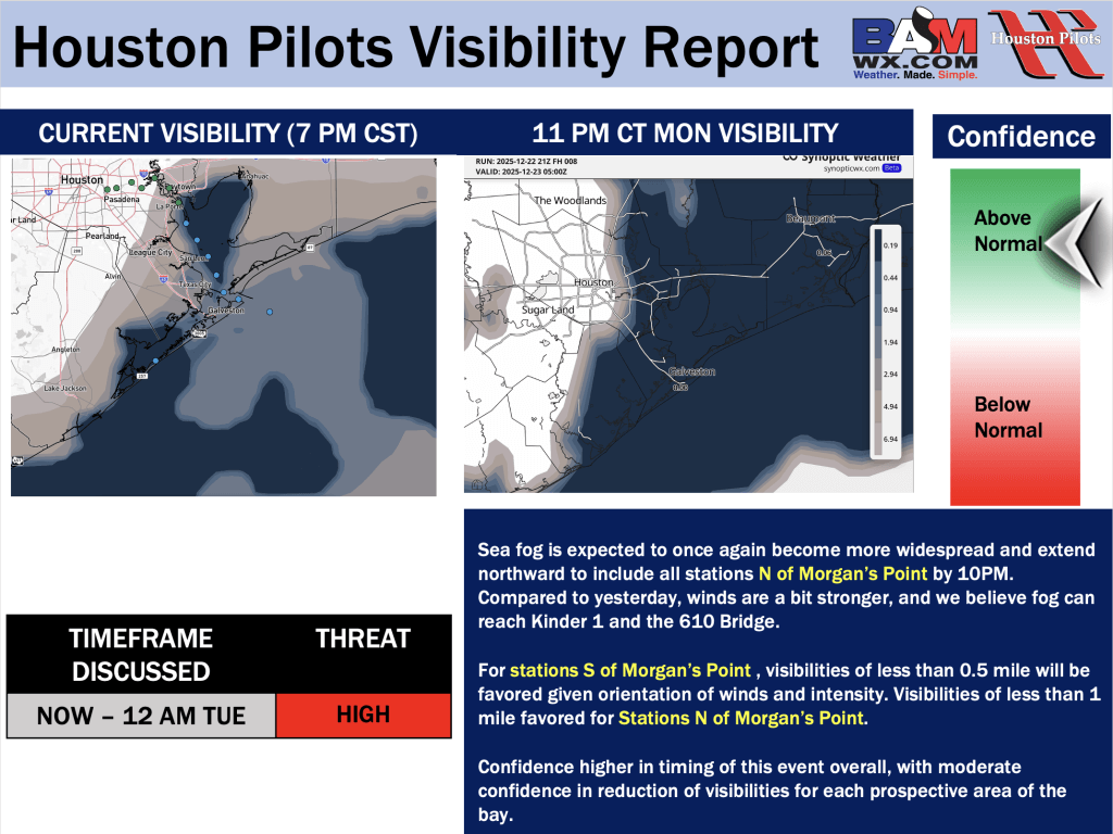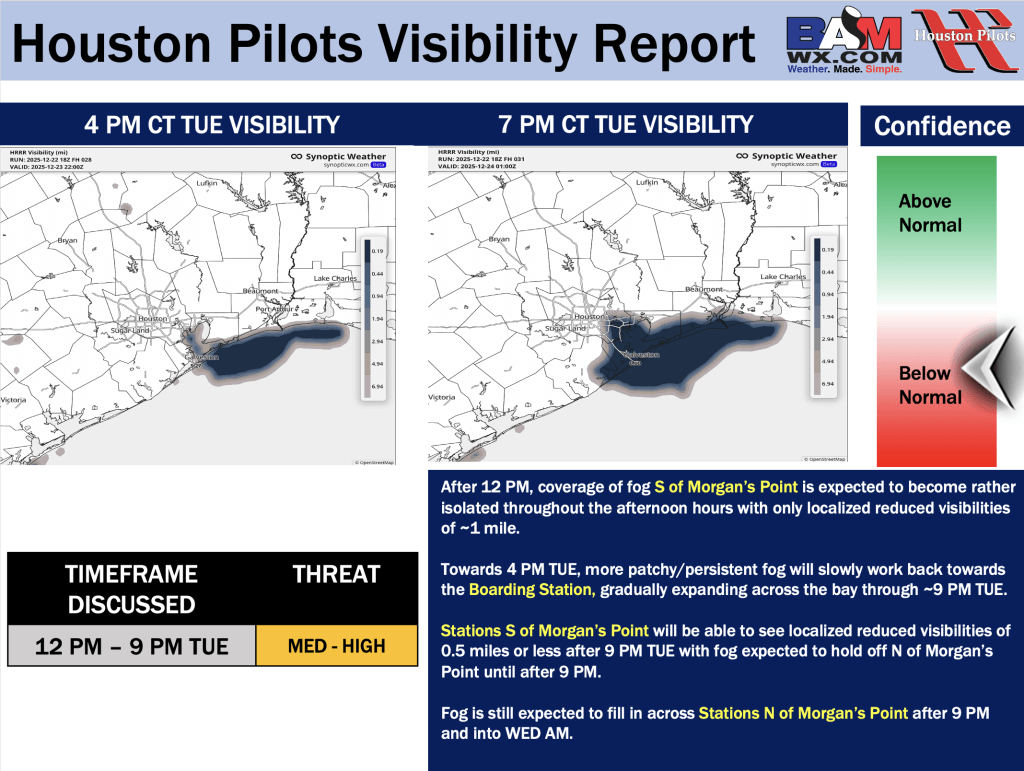 Good Monday PM! Here is your latest Houston Pilots Visibility Update! Visibility Update attached pertains to TODAY AND TUESDAY. If you have any forecast questions, please do not hesitate to reach out via our on call phone number (317)-560-8122, option 1.
