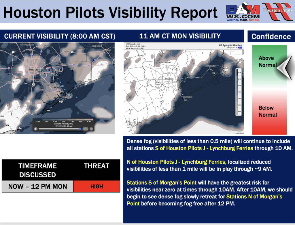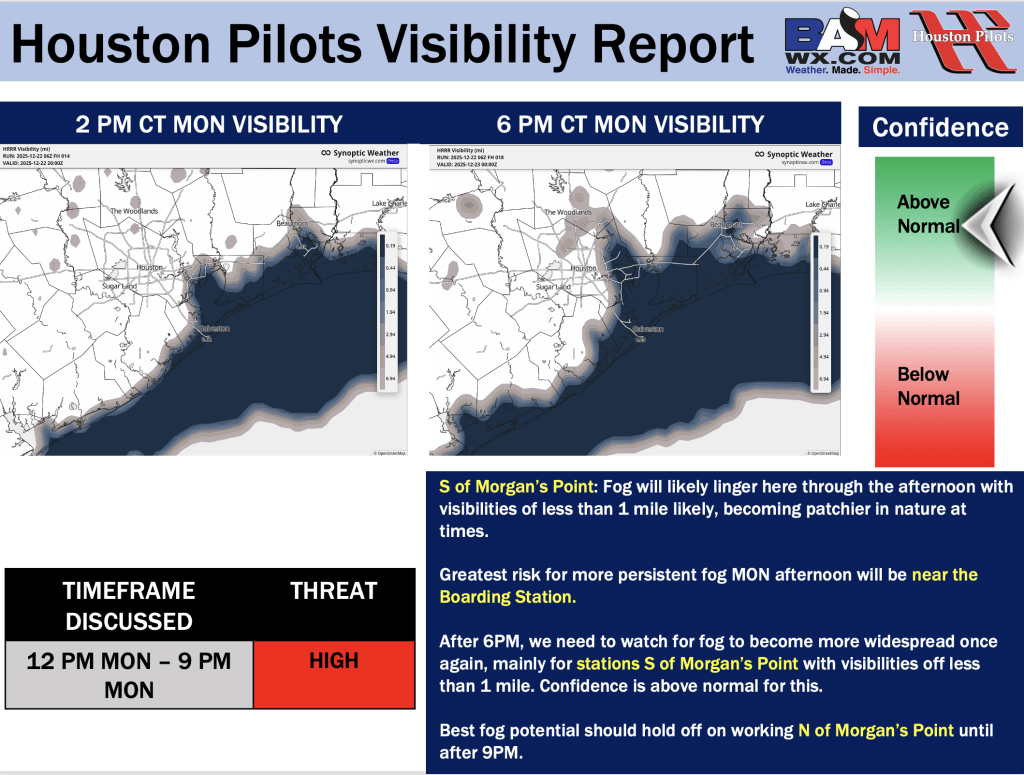 Good Monday Late AM! Here is your latest Houston Pilots Forecast Package/Visibility Update! Visibility Update attached pertains to TODAY through TUE. If you have any forecast questions, please do not hesitate to reach out via our on call phone number (317)-560-8122, option 1.