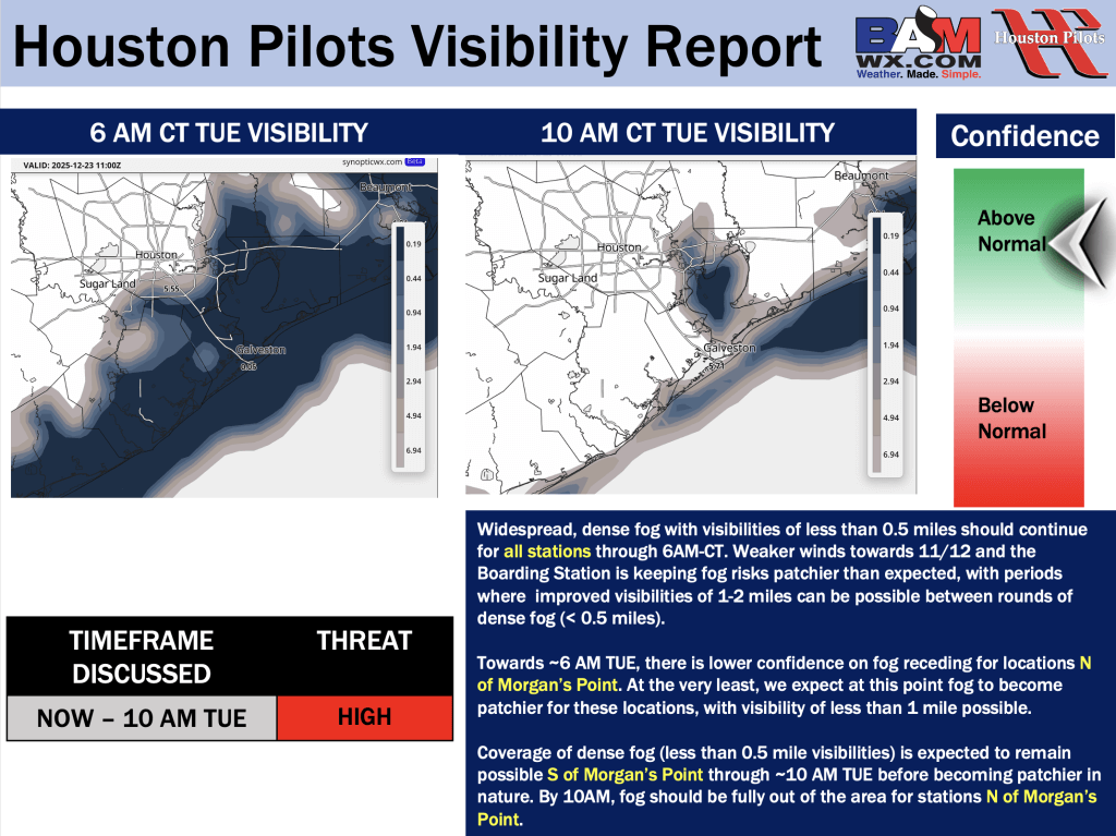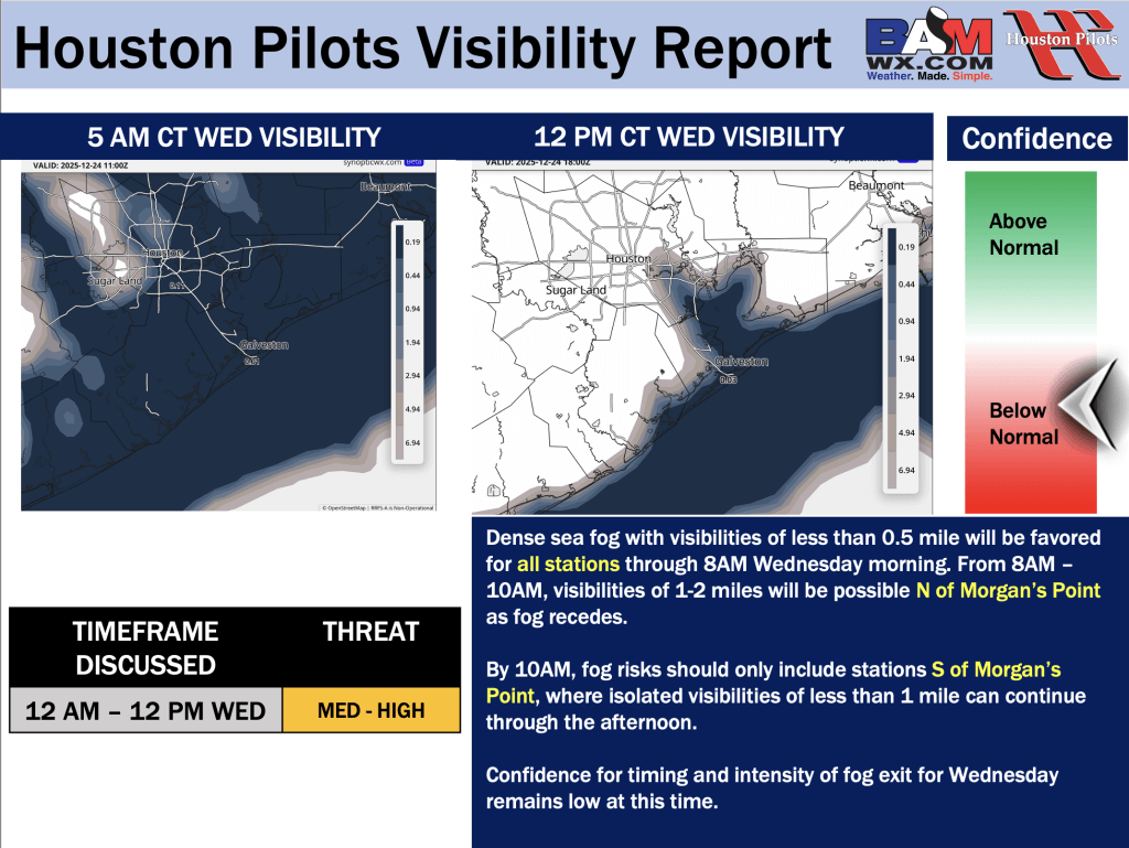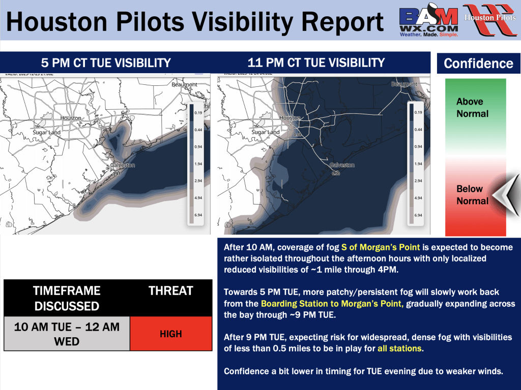 Good Tuesday AM! Here is your latest Houston Pilots Forecast Package / Visibility Update! Visibility Update attached pertains to TODAY AND WEDNESDAY. If you have any forecast questions, please do not hesitate to reach out via our on call phone number (317)-560-8122, option 1.