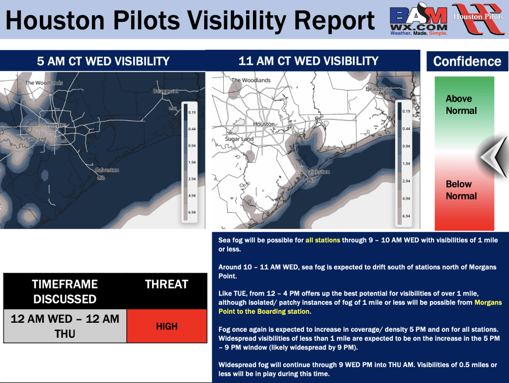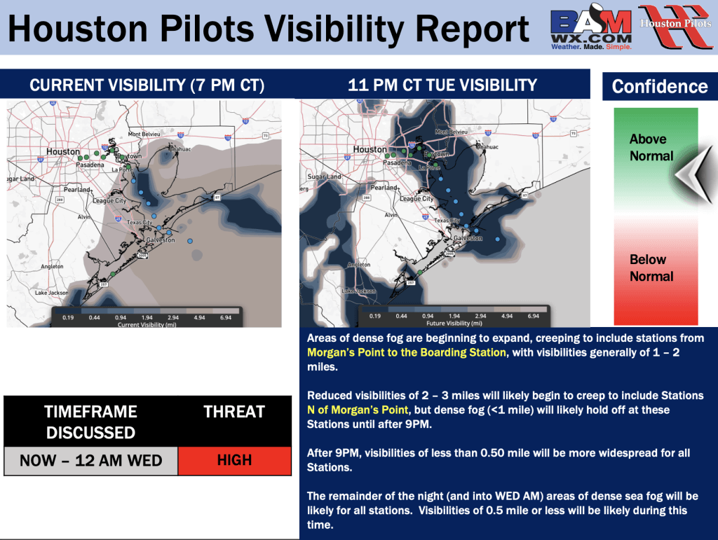 Good Tuesday PM! Here is your latest Houston Pilots Visibility Update! If you have any forecast questions, please do not hesitate to reach out via our on call phone number (317)-560-8122, option 1.