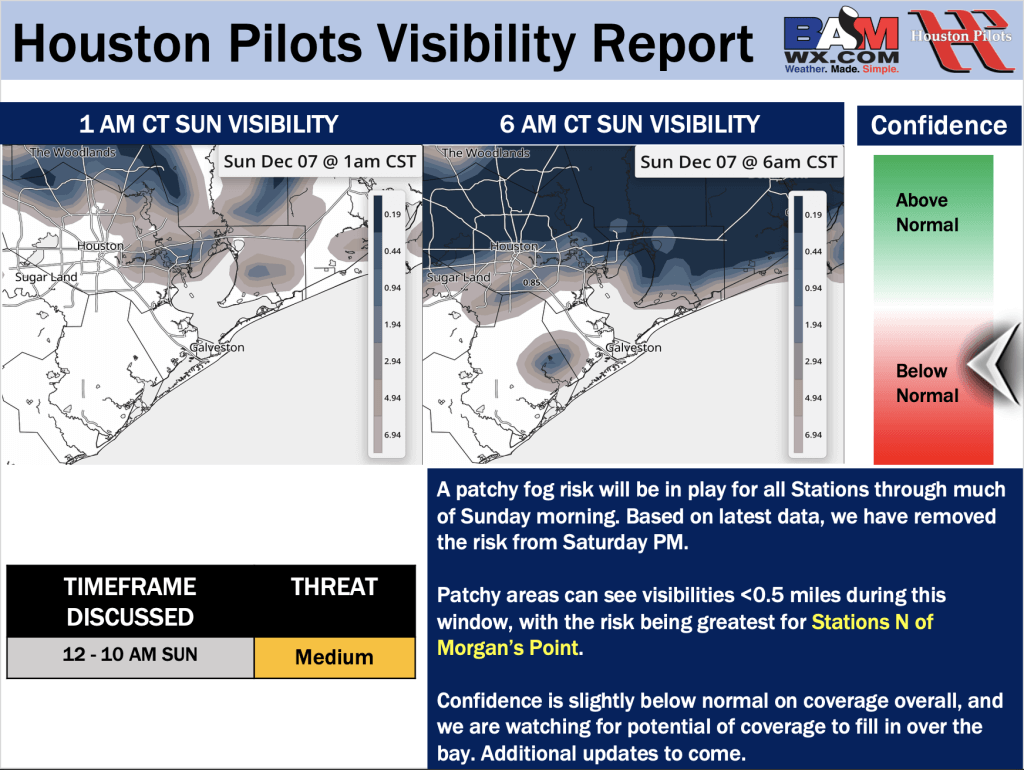 Good Friday PM! Here is your latest Houston Pilots Forecast Package! Visibility Update attached pertains to Sunday AM. If you have any forecast questions, please do not hesitate to reach out via our on call phone number (317)-560-8122, option 1.
