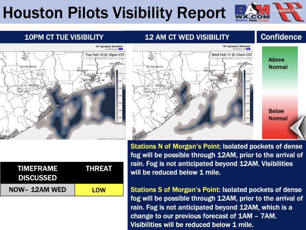 Good Tuesday PM! Here is your latest Houston Pilots Forecast Package/Visibility Update! If you have any forecast questions, please do not hesitate to reach out via our on call phone number (317)-560-8122, option 1.