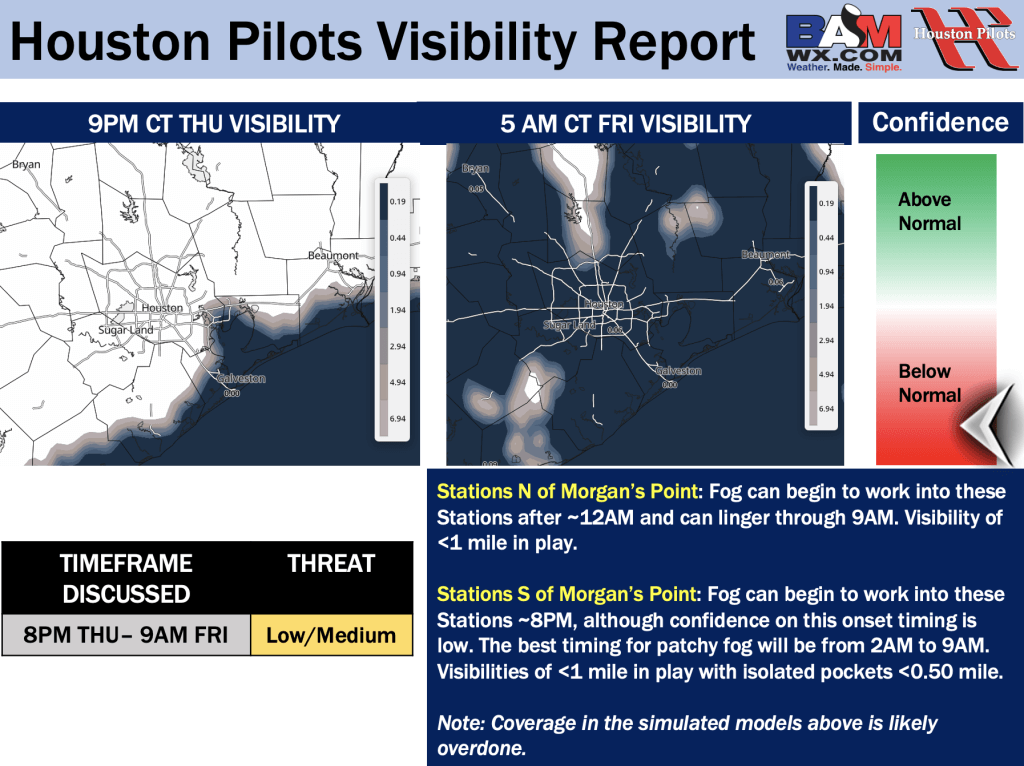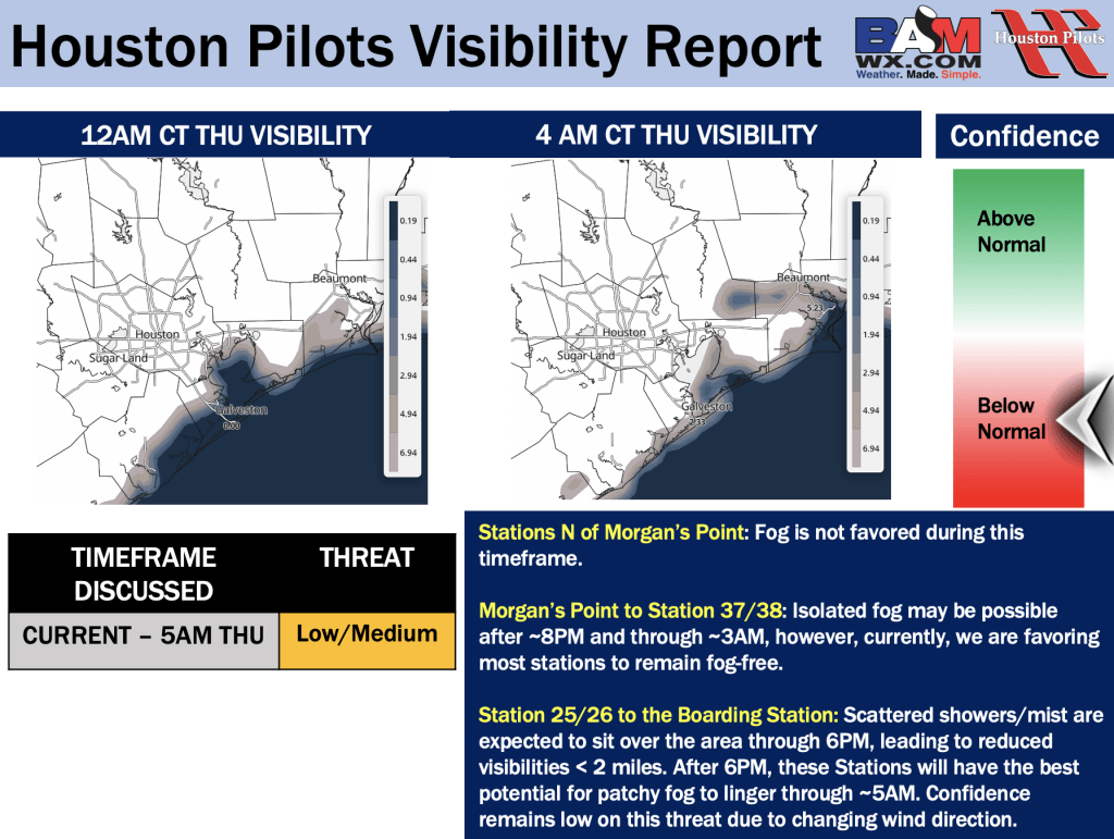 Good Wednesday PM! Here is your latest Houston Pilots Forecast Package/Visibility Update! If you have any forecast questions, please do not hesitate to reach out via our on call phone number (317)-560-8122, option 1.