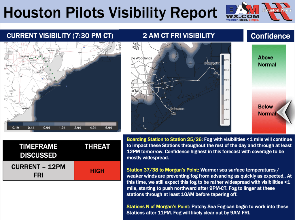 Good Thursday PM! Here is your latest Houston Pilots Forecast Package/Visibility Update! If you have any forecast questions, please do not hesitate to reach out via our on call phone number (317)-560-8122, option 1.