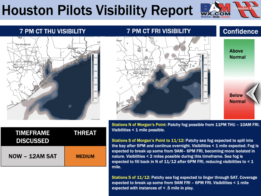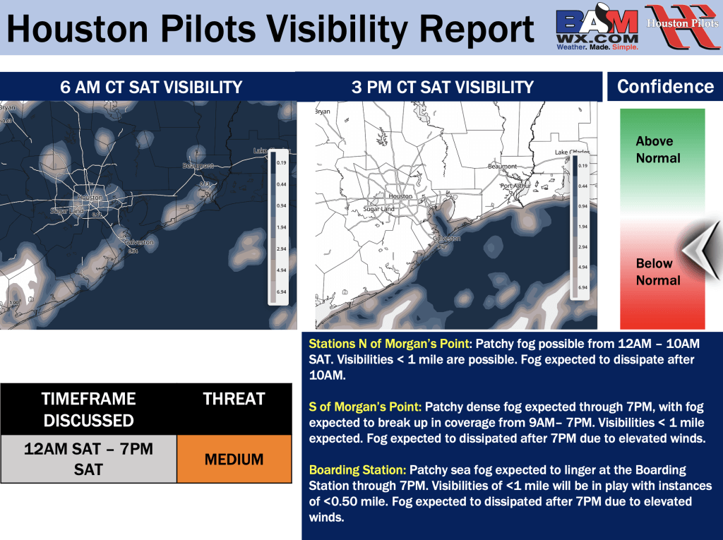 Good Thursday PM! Here is your latest Houston Pilots Forecast Package/Visibility Update! Visibility report attached pertains to today, Friday, and Saturday. If you have any forecast questions, please do not hesitate to reach out via our on call phone number (317)-560-8122, option 1.