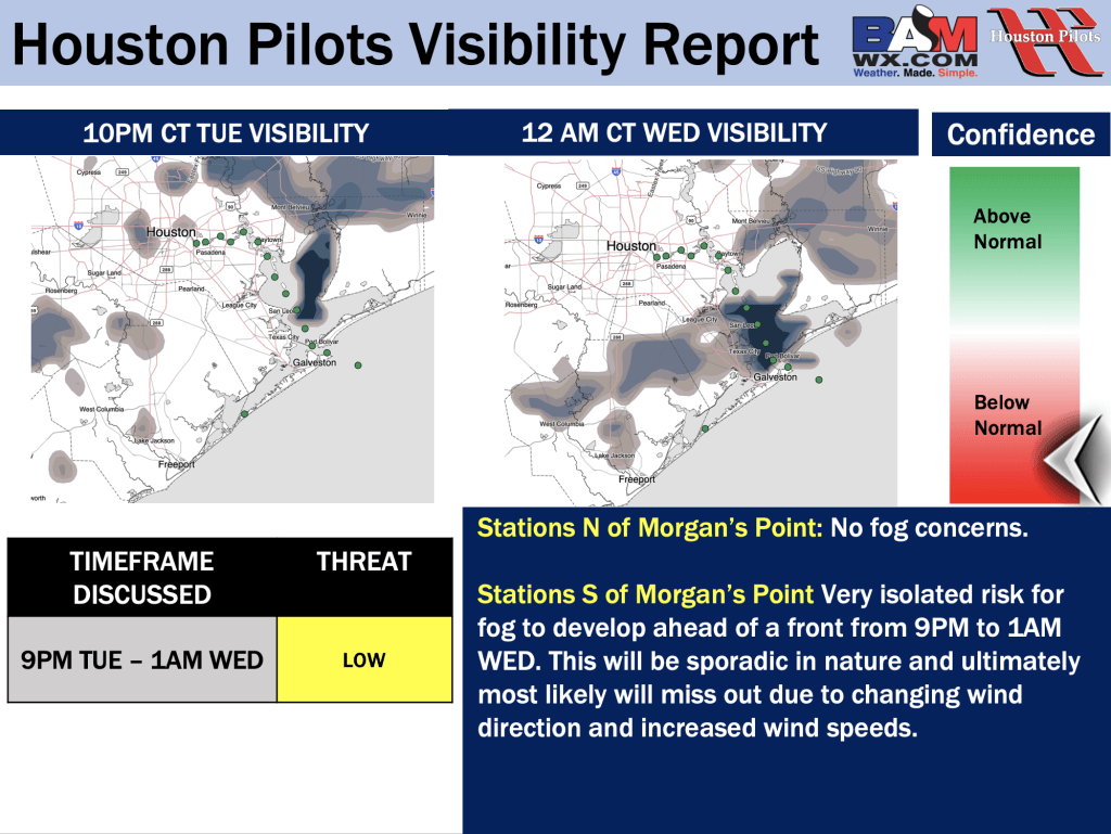 Good Tuesday PM! Here is your latest Houston Pilots Forecast Package/Visibility Update!  If you have any forecast questions, please do not hesitate to reach out via our on call phone number (317)-560-8122, option 1.