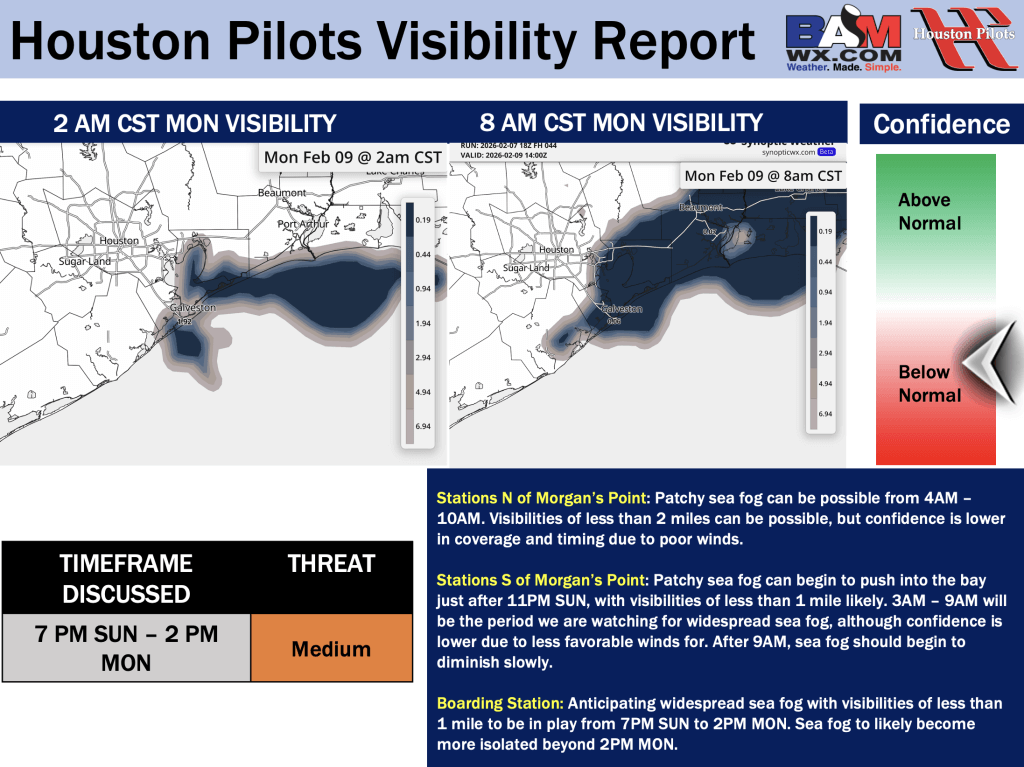 Good Saturday PM! Here is your latest Houston Pilots Forecast Package and Visibility Update! If you have any forecast questions, please do not hesitate to reach out via our on call phone number (317)-560-8122, option 1.