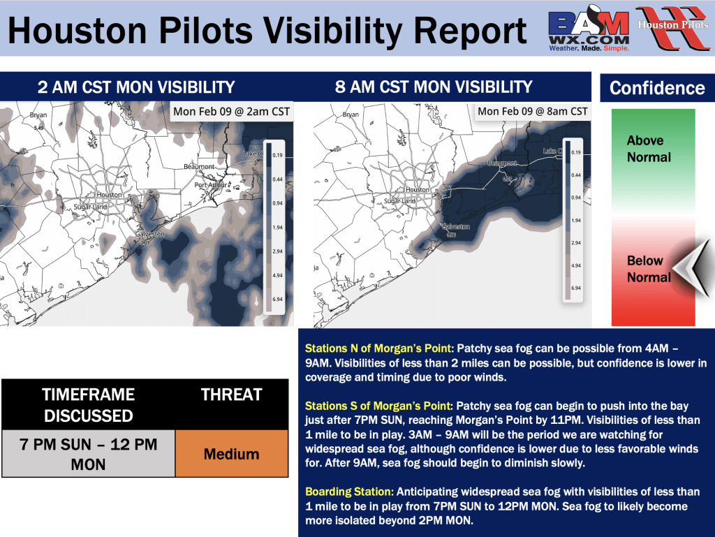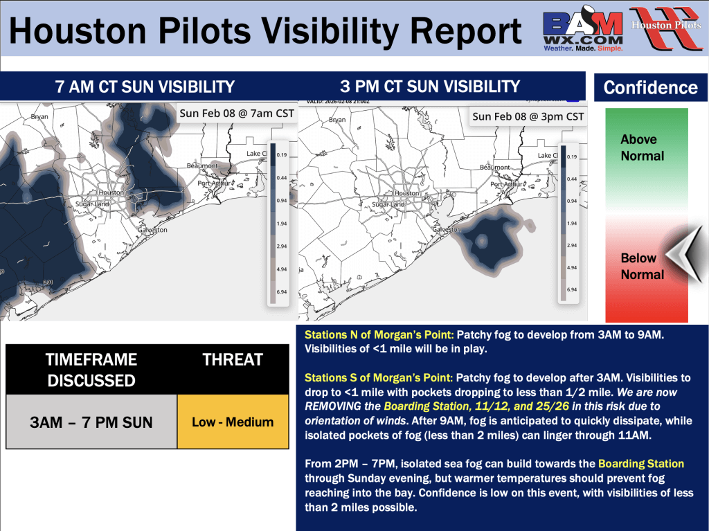 Good Sunday AM! Here is your latest Houston Pilots Forecast Package and Visibility Update! If you have any forecast questions, please do not hesitate to reach out via our on call phone number (317)-560-8122, option 1.