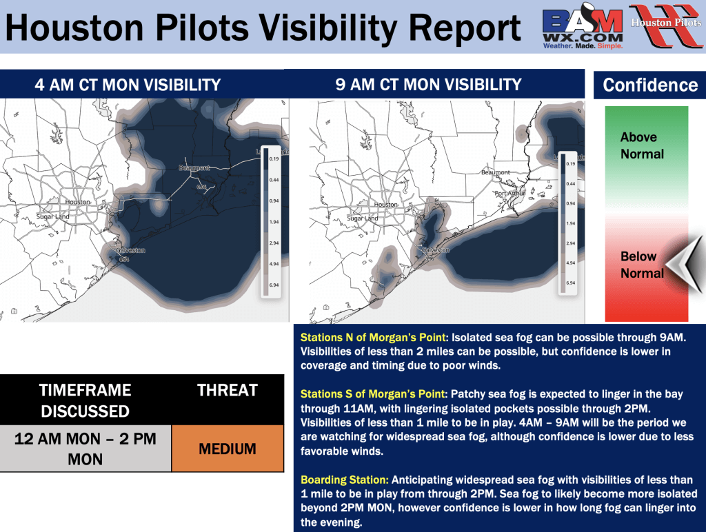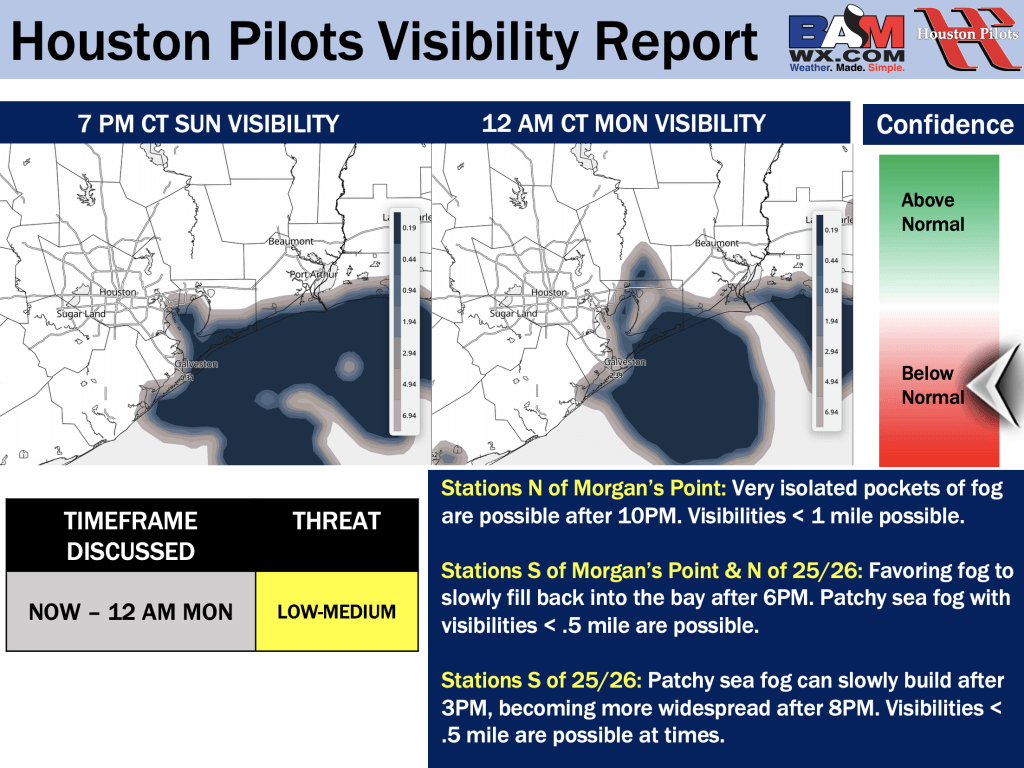 Good Sunday PM! Here is your latest Houston Pilots Forecast Package/Visibility Update! If you have any forecast questions, please do not hesitate to reach out via our on call phone number (317)-560-8122, option 1.