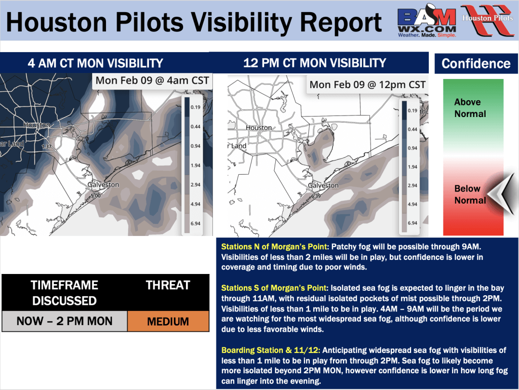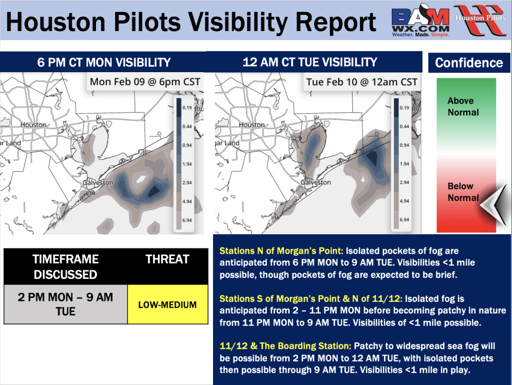 Good Monday AM! Here is your latest Houston Pilots Forecast Package/Visibility Update! If you have any forecast questions, please do not hesitate to reach out via our on call phone number (317)-560-8122, option 1.