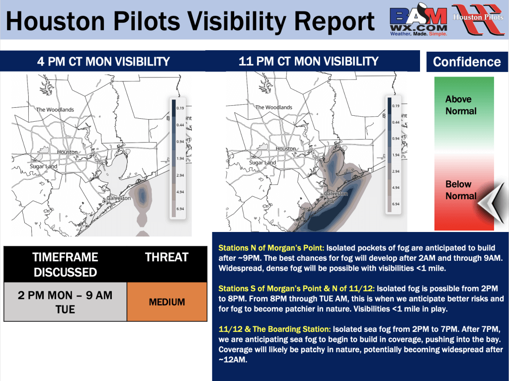 Good Monday AM! Here is your latest Houston Pilots Visibility Update! If you have any forecast questions, please do not hesitate to reach out via our on call phone number (317)-560-8122, option 1.