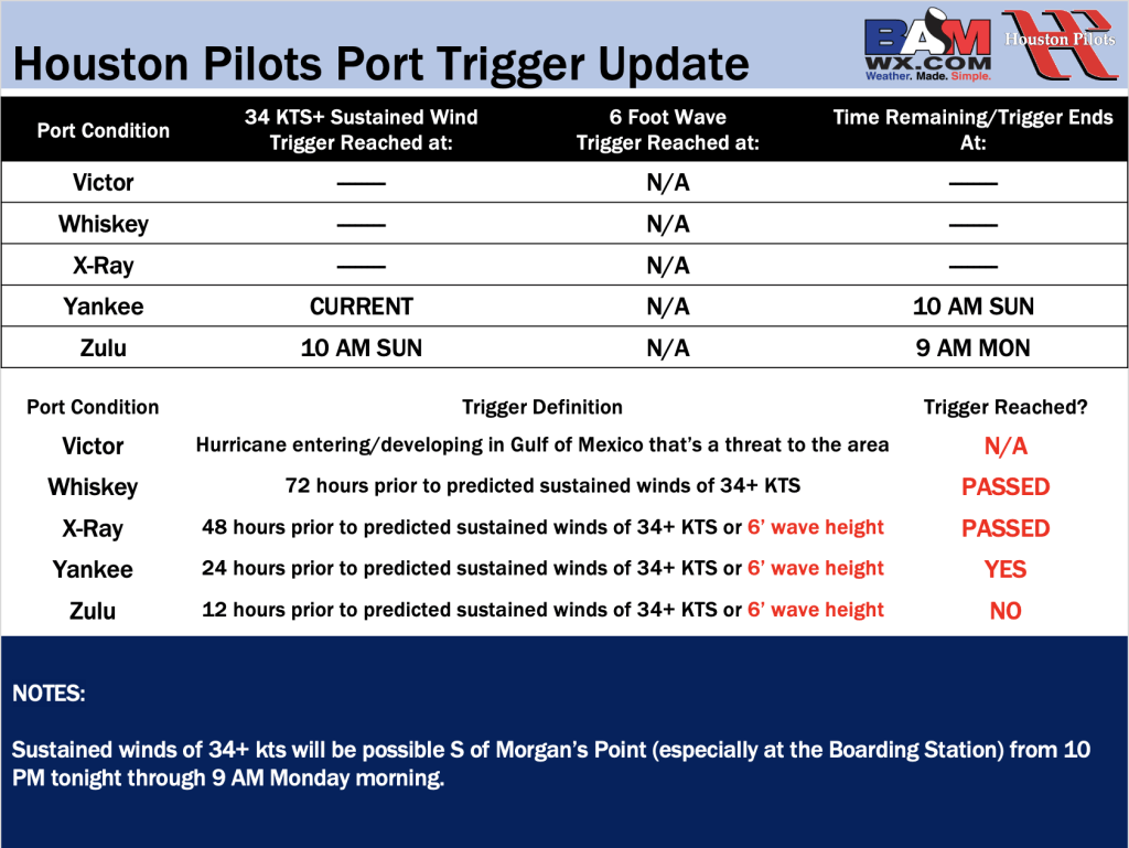 Good Sunday AM! Here is your latest Houston Pilots Forecast Package! Yankee Port Conditions remain in effect through 10 AM today due to sustained winds of 34+ kts expected after 10 PM tonight. If you have any forecast questions, please do not hesitate to reach out via our on call phone number (317)-560-8122, option 1.