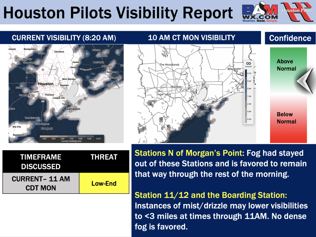 Good Monday AM! Here is your latest Houston Pilots Visibility Update! If you have any forecast questions, please do not hesitate to reach out via our on call phone number (317)-560-8122, option 1.