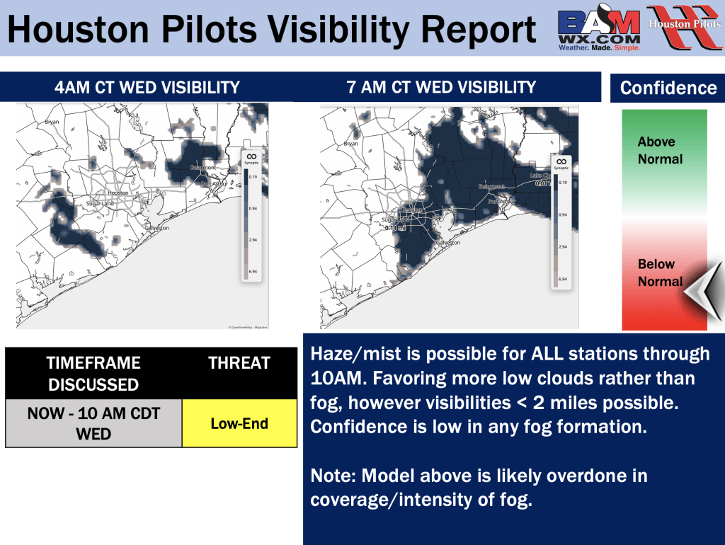 Good Wednesday AM! Here is your latest Houston Pilots Forecast Package/Visibility Update! If you have any forecast questions, please do not hesitate to reach out via our on call phone number (317)-560-8122, option 1.